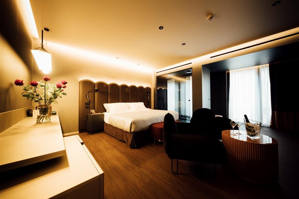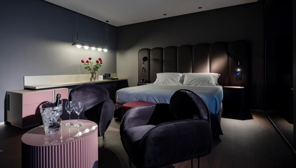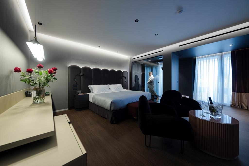 Il desiderio della proprietà con cui abbiamo condiviso in pieno tutta la filosofia del progetto – spiega l’architetto Piva – era innanzitutto di proporre un albergo con un taglio internazionale e business che consentisse a ospiti in arrivo da ogni dove di fare un’esperienza unica che permettesse loro di capire che conoscere e vivere Matera significa guardarla costantemente da diverse prospettive, per ammirare tutto quello che c’è di unico, dall’antico quartiere dei Sassi al Duomo, dal Castello del Conte Tramontano alle vivaci vie centrali, dalle chiese agli ipogei del Piano. Proprio per questo allora la grande lounge a pianterreno e le terrazze panoramiche, si aprono sulla città creando un luogo versatile, nuovo punto di socialità urbana ed espressione delle necessità umane moderne, improntate alla volontà di conoscere il tessuto urbano in cui sono inseriti. D’altra parte, come sempre accade nei miei progetti per il mondo dell’accoglienza, c’era poi l’esigenza di proporre agli ospiti un albergo che fosse una vera “seconda casa”, filosoficamente, e allo stesso tempo un luogo per staccare dalla quotidianità e rilassarsi, senza per questo dover rinunciare al comfort. Questo grazie a un’eccellenza che si respira in molti ambiti, tra i quali spicca ovviamente quello legato al riposo e al buon sonno. Qui allora dal “come a casa” si passa obbligatoriamente al “meglio che a casa” perché quando ci si vuole rilassare non ci sono compromessi ma solo espressione di qualità massima. Che è quella che abbiamo trovato grazie a un partner come Dorelan – individuato dalla proprietà dell’hotel e poi condiviso anche da me con convinzione – che ci ha messo a disposizione il suo know-how unico per realizzare un sistema letto ad hoc, il cui super comfort è stato apprezzatissimo dagli ospiti. Oggi così a disposizione dei clienti l’albergo è in grado di mettere 40 suite di diverse metrature, dotate di spazi flessibili e complementi d’arredo su misura – dalle testate dei letti ai bagni – tutti caratterizzati da un cromatismo omogeneo che rimanda alla domesticità.