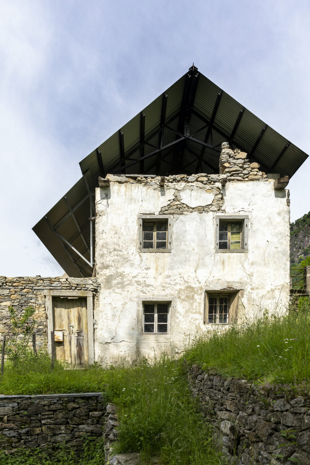Qui il committente ha richiesto che dal complesso venisse ricavata una residenza per le vacanze, ma realizzata con mezzi semplici e risorse limitate. Le condizioni – soprattutto quelle della casa principale – erano davvero pessime, con tutti gli elementi in legno, come le strutture a travi o i solai intermedi, in avanzato stato di degrado. L’edificio principale è stato quindi trasformato in una grande sala estiva, mentre l’annesso, meglio conservato, è stato convertito in uno spazio abitativo invernale. Lo studio Buchner Bründler Architekten ha quindi optato per un intervento insolito e per certi versi innovativo, che si pone a metà tra autenticità e interpretazione contemporanea: un compromesso tra messa in sicurezza dell’esistente e ristrutturazione.