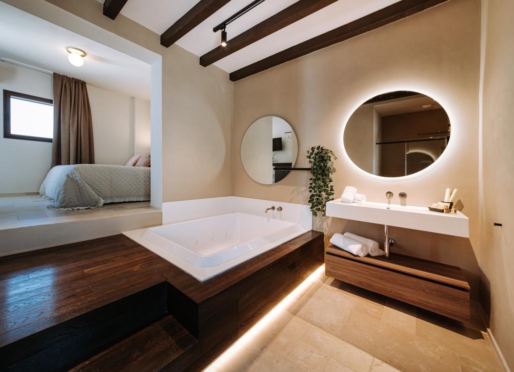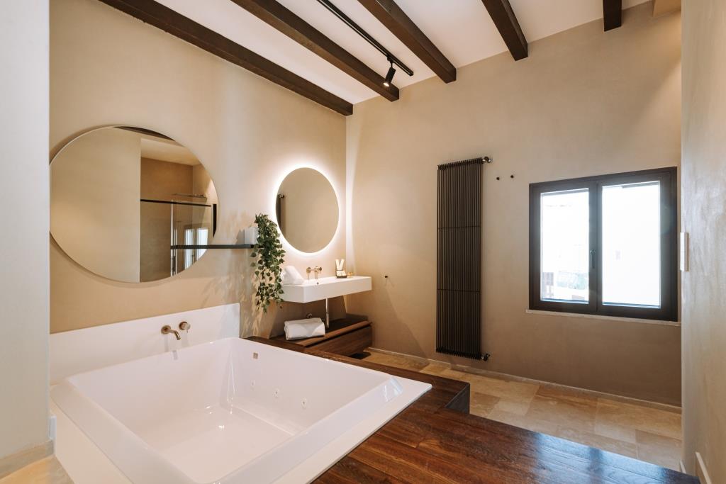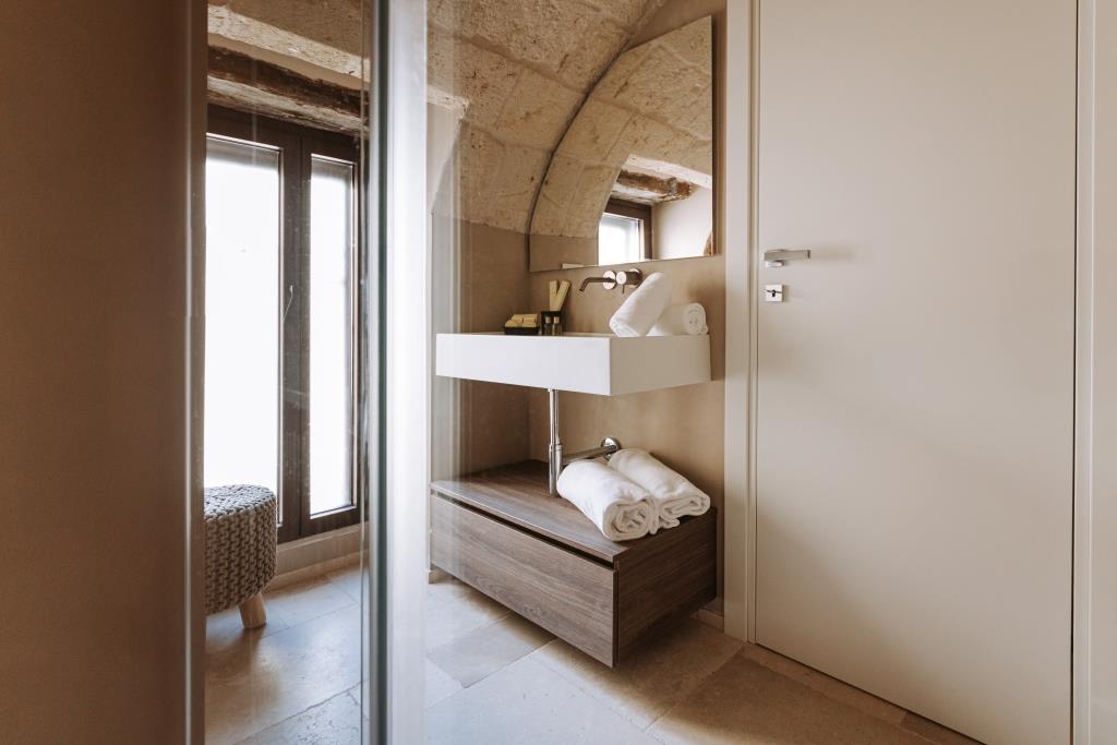 Le stanze, dislocate in edifici diversi ma vicini tra loro, sono eleganti e raffinate affiancate da bagni che si distinguono per i profili geometrici dei lavabi, le circonferenze degli specchi, le curve dei rubinetti e le trasparenze dei box doccia che creano una vera e propria sinfonia di dettagli che emoziona l’occhio.