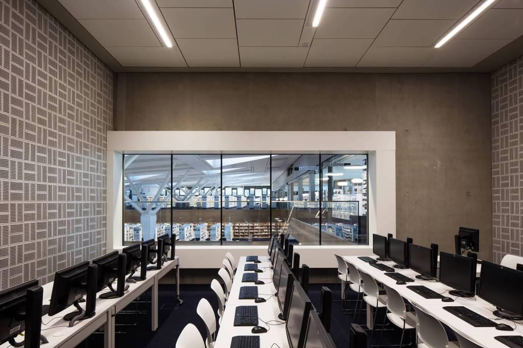 Completa il progetto il sistema segnaletico e orientativo modulare disegnato da Pentagram, basato su 25.000 cubi di resina numerici e alfabetici, 6.000 tableau e 2.400 caratteri numerici per le scaffalature: un sistema flessibile che si può facilmente modificare nel tempo, adattandosi all’evoluzione della biblioteca.
