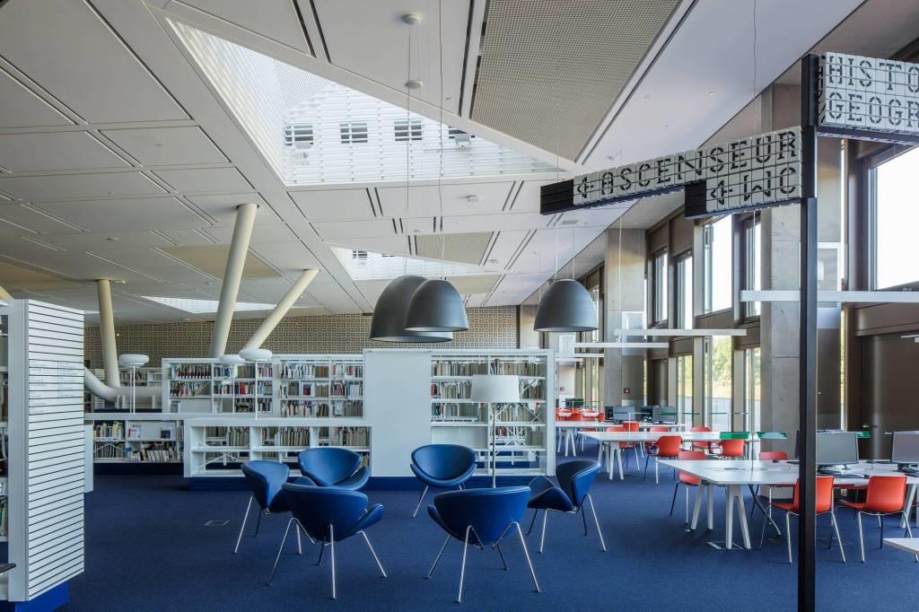 Anche il colore è protagonista: per la sala di lettura dei periodici, completamente rossa, e per il grande tappeto blu intenso delle aree pubbliche.