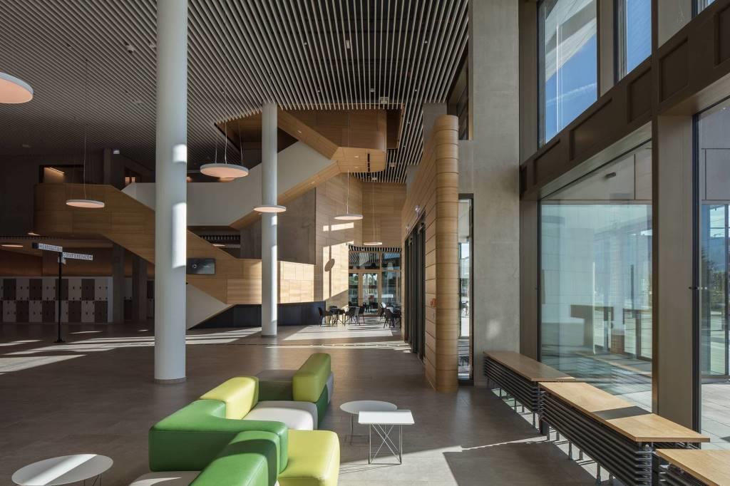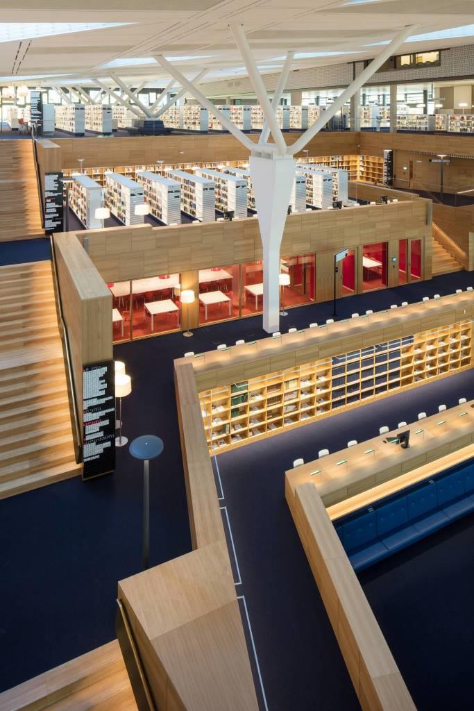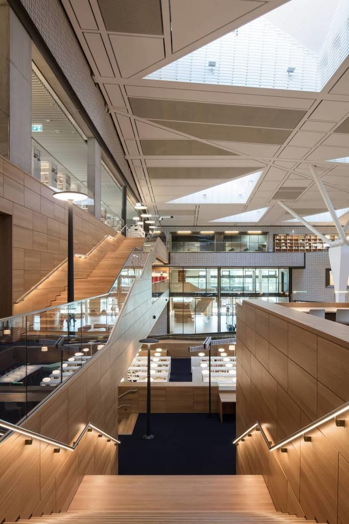 ai temi energetici. Scartati i rivestimenti a cappotto, lo studio ha optato per un sistema basato sulla massa termica dell’edificio – a cui contribuisce il pesante rivestimento di facciata – e su alcuni accorgimenti passivi. Ad esempio il tetto in legno lamellare è dotato di griglie all’intradosso, che fanno circolare l’aria al suo interno e lo rendono termicamente attivo, mentre un sistema notturno di apertura dei serramenti raffresca l’edificio, grazie all’aria che per effetto camino fuoriesce dai lucernari triangolari. Questi – orientati a nord – sono fra gli elementi caratteristici della biblioteca, già presenti negli schizzi di Peter Wilson, come il pavimento blu intenso da cui emergono gli scaffali e la scala volumetrica a spirale che connette il foyer con la sala conferenze.