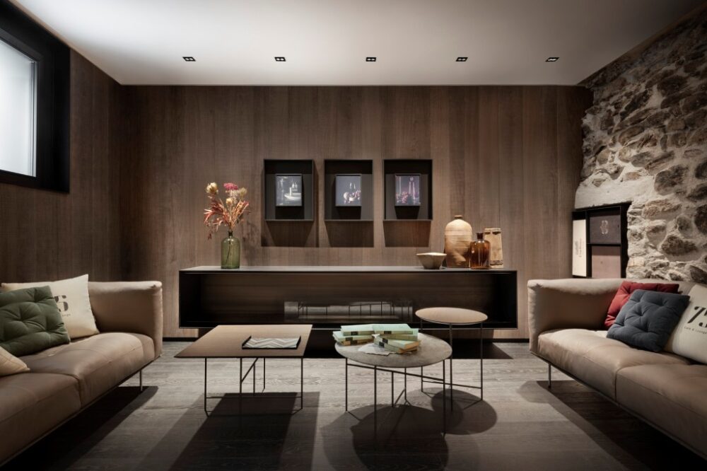 Il concept definito da Lissoni Associati è chiaro fin dall’ingresso, ovvero riportare l’ospite al calore e all’accoglienza di una volta realizzando un luogo contemporaneo dall’atmosfera montana, che reinterpretasse i codici stilistici dell’architettura alpina e delle baite. Obiettivo peraltro ricercato e condiviso dai committenti Luca e Stefano Nigri, famiglia di albergatori da ben tre generazioni.
