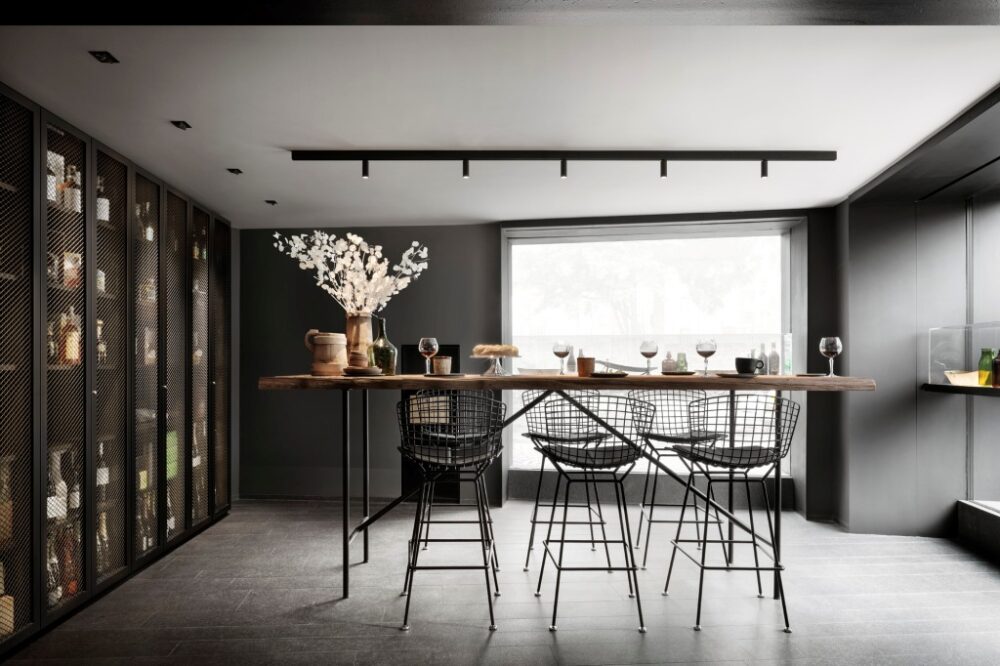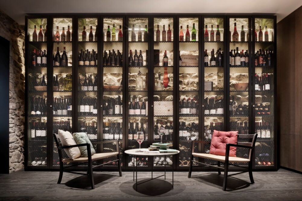 Molti gli arredi realizzati su misura, tra i quali il bancone del bar in pietra lavica, i tavoli, le panche e il camino della sala lounge – lo spazio più intimo e accogliente del locale – nonché tutti gli espositori in rete metallica che mostrano, proteggendole, le bottiglie di vino: oltre mille etichette frutto di una meticolosa e accurata selezione.