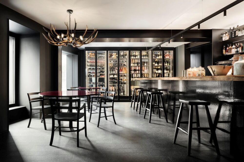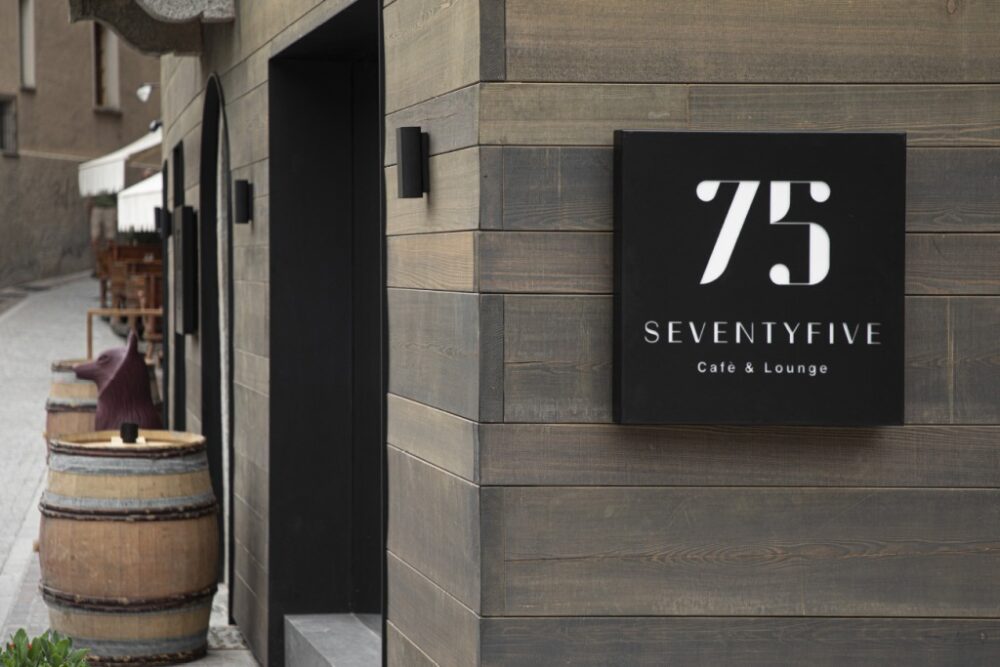 Al Seventyfive Wine Bar si respira l’atmosfera montana ma l’appeal è glamour e internazionale. Piero Lissoni, con la sua cifra inconfondibile, reinterpreta i codici stilistici dell’architettura alpina e delle baite