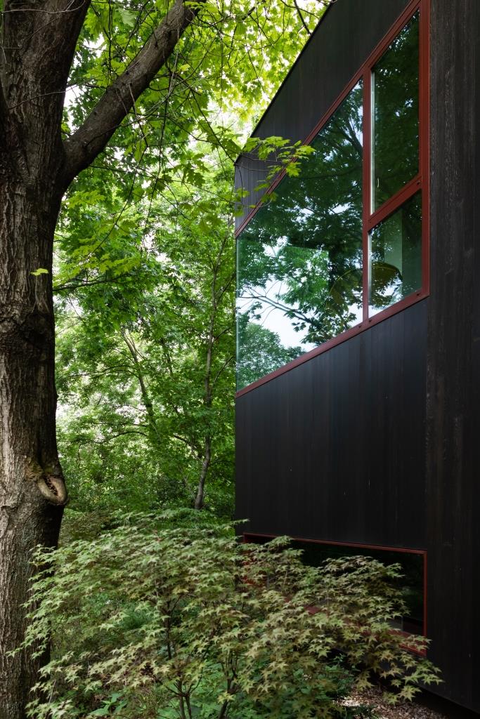 Sono proprio i viaggi, infatti, la principale fonte d’ispirazione di un progetto architettonico caratterizzato da volumi rigorosi che seguono la linea del terreno, ampie vetrate che mettono in relazione interno ed esterno, e un rivestimento in legno scuro inframmezzato dai profili rossi di porte e finestre.