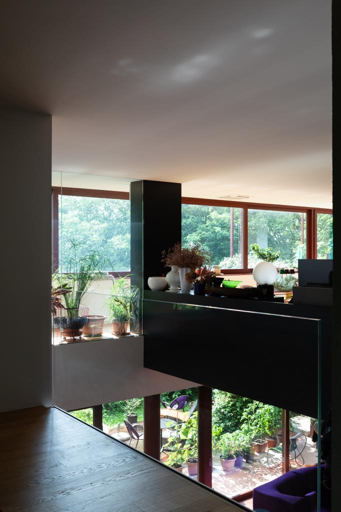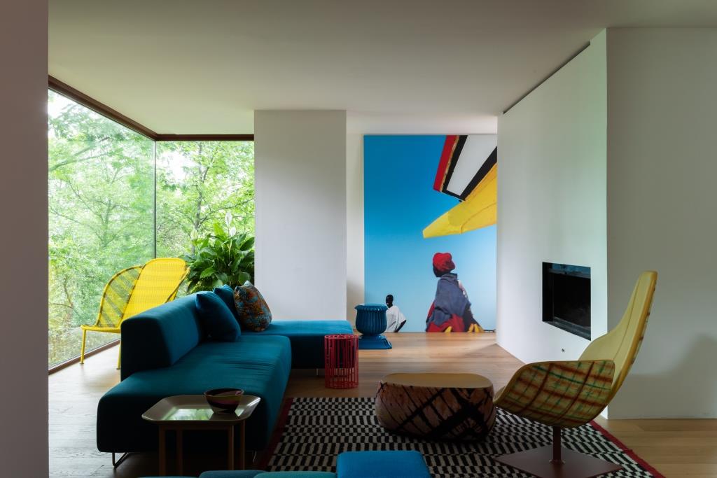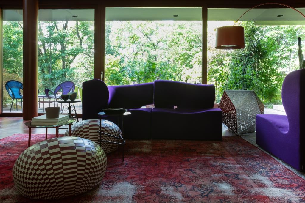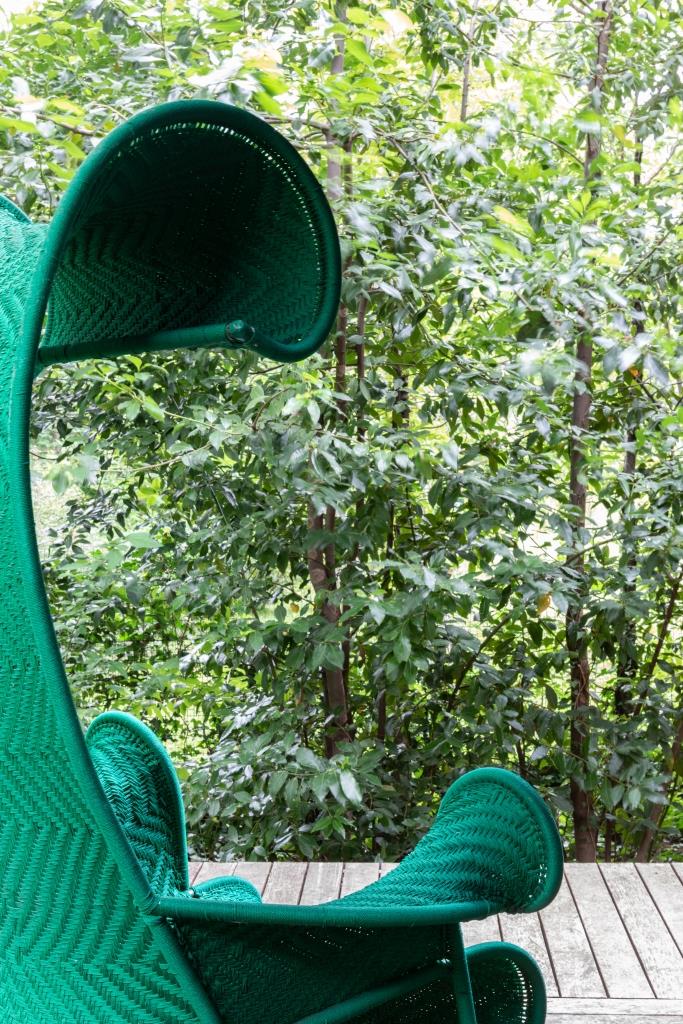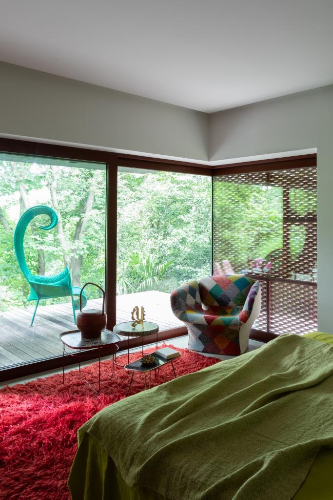 Il risultato è una full immersion nell’universo di Patrizia Moroso, nel suo immaginario, nel suo gusto estetico. Una residenza su due livelli completamente immersa nel verde: dal piano terra, quello più votato alla socialità, si osserva il bosco all’altezza dei tronchi possenti che lo compongono; al piano superiore lo sguardo cade sulle chiome degli alberi, quasi come in una fiaba.