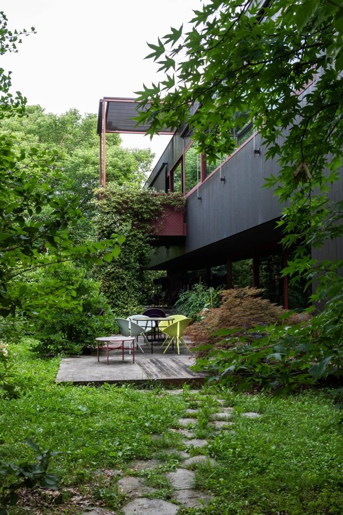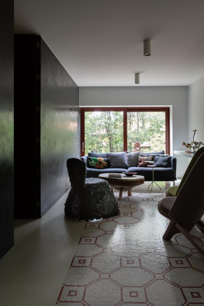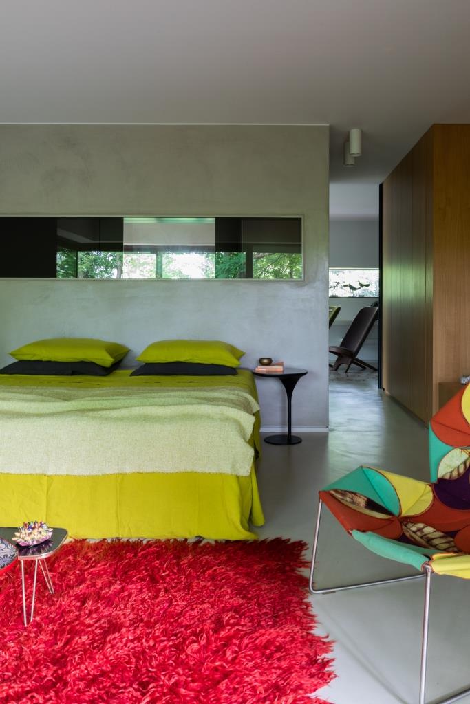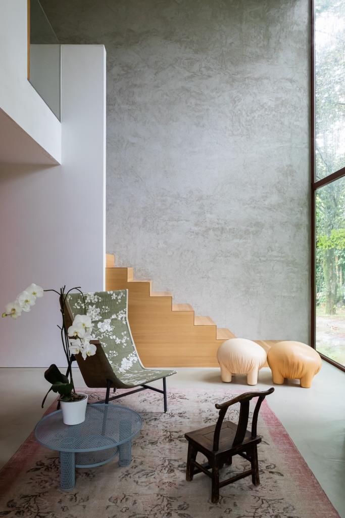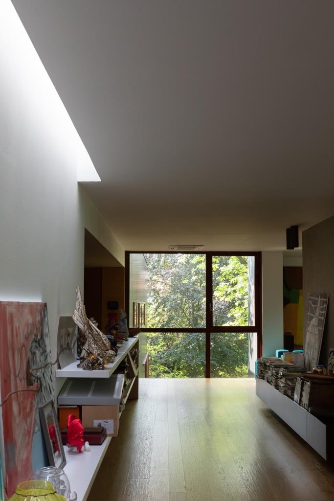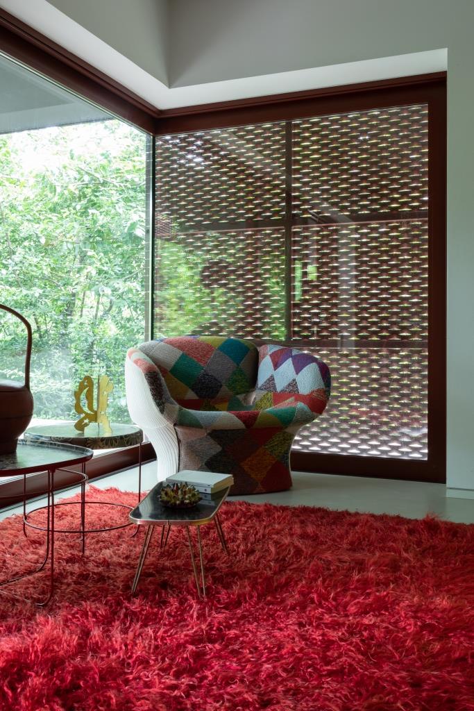 Il risultato è una full immersion nell’universo di Patrizia Moroso, nel suo immaginario, nel suo gusto estetico. Una residenza su due livelli completamente immersa nel verde: dal piano terra, quello più votato alla socialità, si osserva il bosco all’altezza dei tronchi possenti che lo compongono; al piano superiore lo sguardo cade sulle chiome degli alberi, quasi come in una fiaba.
