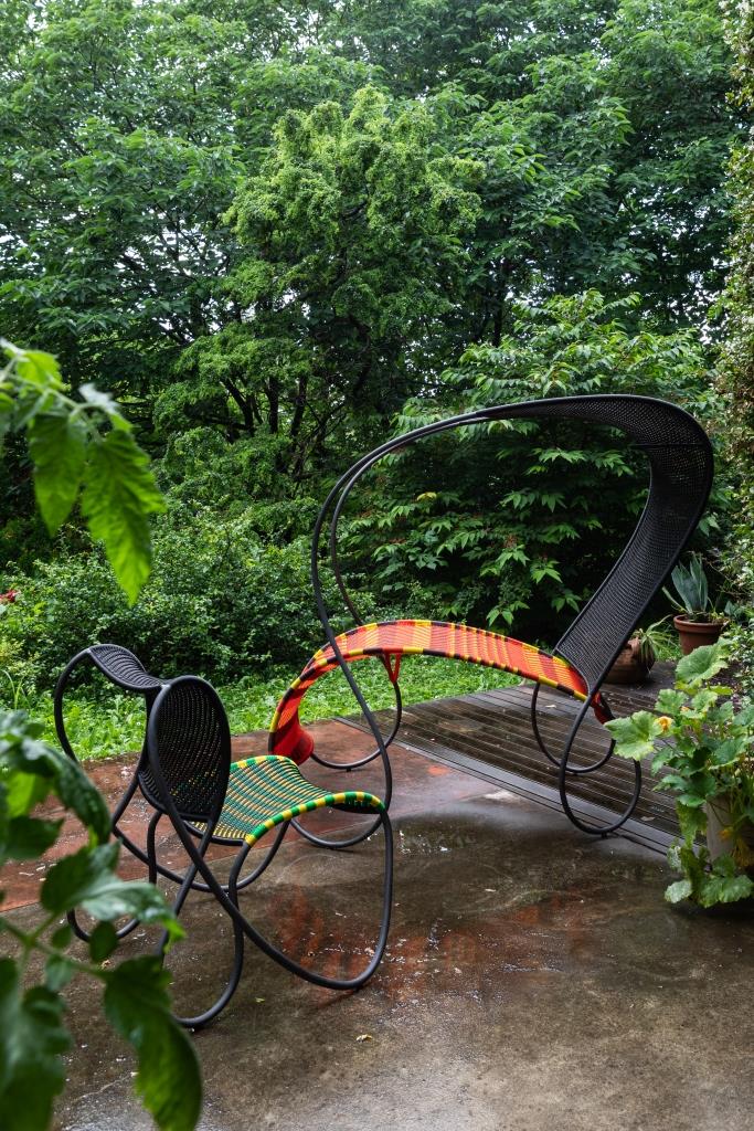 Una scelta non casuale: il nero è una tonalità simbolica che rimanda ai tronchi d’albero così come agli attrezzi da lavoro africani; il rosso è qui proposto in una nuance terrosa che torna anche sul pavimento in resina di uno dei salotti interni e che ricorda le sfumature cromatiche di certi paesaggi, il colore delle foglie in autunno, un mondo dal sapore quasi ancestrale che Patrizia e il marito Abdu Salam Gaye hanno conosciuto da bambini, lei nella cascina dei nonni in Friuli, lui nell’abitazione dove è cresciuto a Dakar.