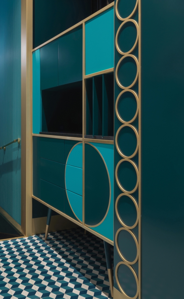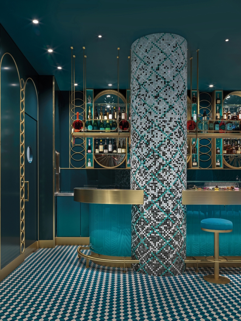 Le geometrie sulle quali si gioca il design degli interni sono semplici e nascono dalla ripetizione modulare del cerchio, riproposto nei fregi a parete, in ottone spazzolato, nella bottiglieria al di sopra del bancone in ottone fresato e nei motivi dei mobili disegnati su misura. Ma il cerchio domina anche negli elementi architettonici sospesi in vetro colorato in pasta, che richiamano alla memoria i vetri piombati di una volta. A terra si ripropone un geometrismo spinto con una pavimentazione a rombi a effetto tridimensionale sui toni degli azzurri, che ben si sposa con l’ottanio della boiserie, il turchese del bancone in vetro diamantato e dei divani avvolgenti in velluto. In velluto anche le poltrone ma di un rosso acceso che grida al contrasto. Due pilastri over size rivestiti in mosaico spezzano il bancone in ottone fresato e inseriscono due macro elementi di spicco nell’insieme dei dettagli di design.