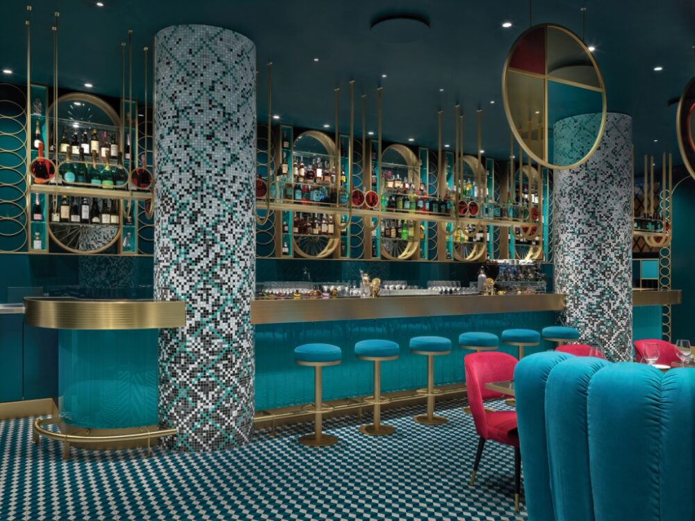 Le geometrie sulle quali si gioca il design degli interni sono semplici e nascono dalla ripetizione modulare del cerchio, riproposto nei fregi a parete, in ottone spazzolato, nella bottiglieria al di sopra del bancone in ottone fresato e nei motivi dei mobili disegnati su misura. Ma il cerchio domina anche negli elementi architettonici sospesi in vetro colorato in pasta, che richiamano alla memoria i vetri piombati di una volta. A terra si ripropone un geometrismo spinto con una pavimentazione a rombi a effetto tridimensionale sui toni degli azzurri, che ben si sposa con l’ottanio della boiserie, il turchese del bancone in vetro diamantato e dei divani avvolgenti in velluto. In velluto anche le poltrone ma di un rosso acceso che grida al contrasto. Due pilastri over size rivestiti in mosaico spezzano il bancone in ottone fresato e inseriscono due macro elementi di spicco nell’insieme dei dettagli di design.