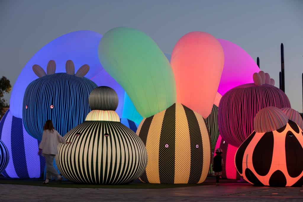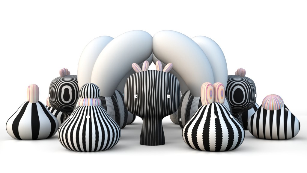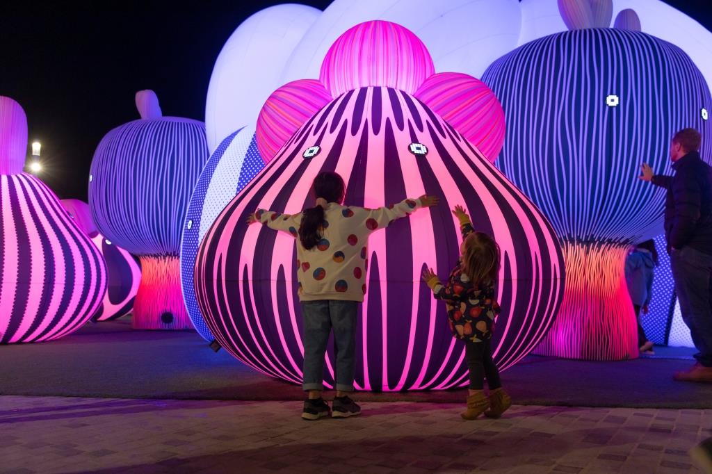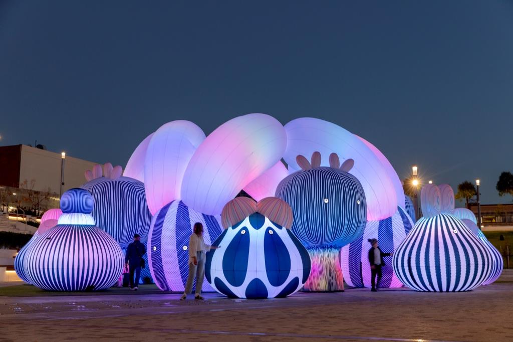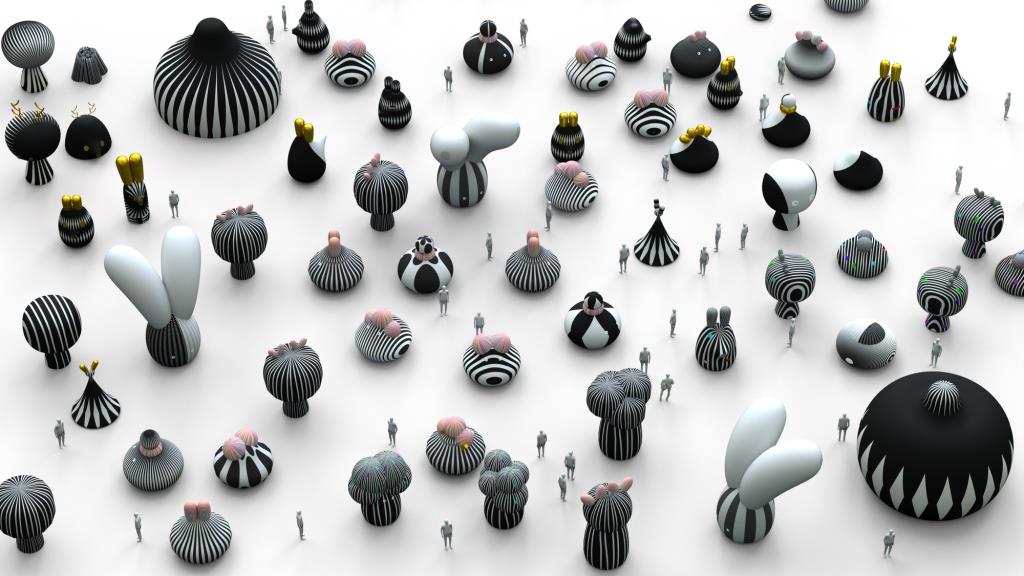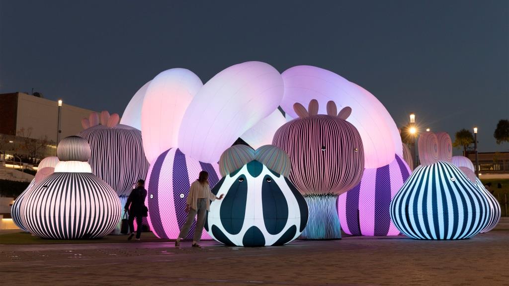 Inoltre, alla morbida materialità delle forme dei suoi protagonisti l’installazione unisce anche dettagli intriganti e sorprendenti tutti da scoprire, come l’inclusione di occhi a led che lampeggiano al passaggio dei visitatori e li seguono da una creatura all’altra, rendendo l’esperienza ancor più giocosa e coinvolgente e trasformando la dimensione dello spazio pubblico in un palcoscenico intergenerazionale, in cui tutti possono riscoprire la loro anima bambina.
