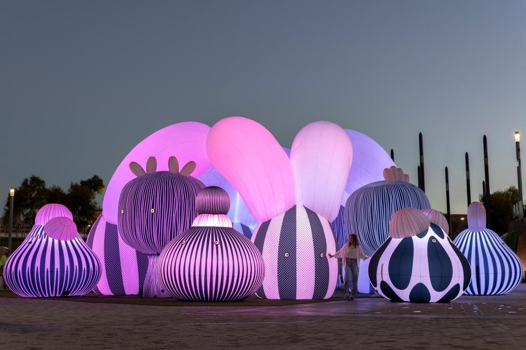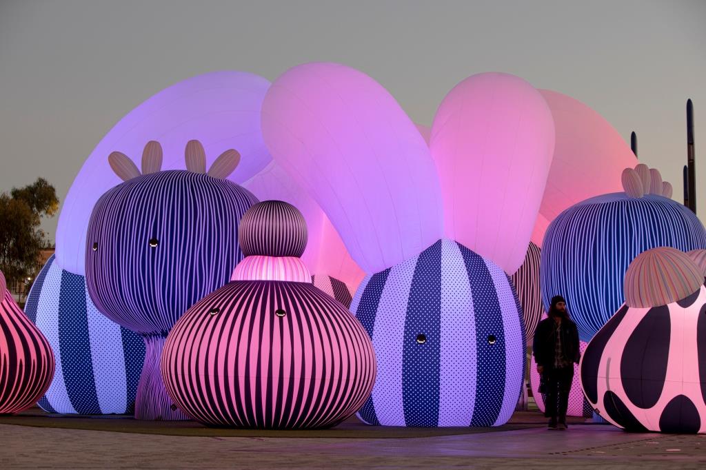 Sedici grandi figure gonfiabili, dotate di sensori di movimento collegati in rete, reagiscono alla presenza dei passanti cambiando colore e generando veri e propri scenari sonori, ogni sera diversi.