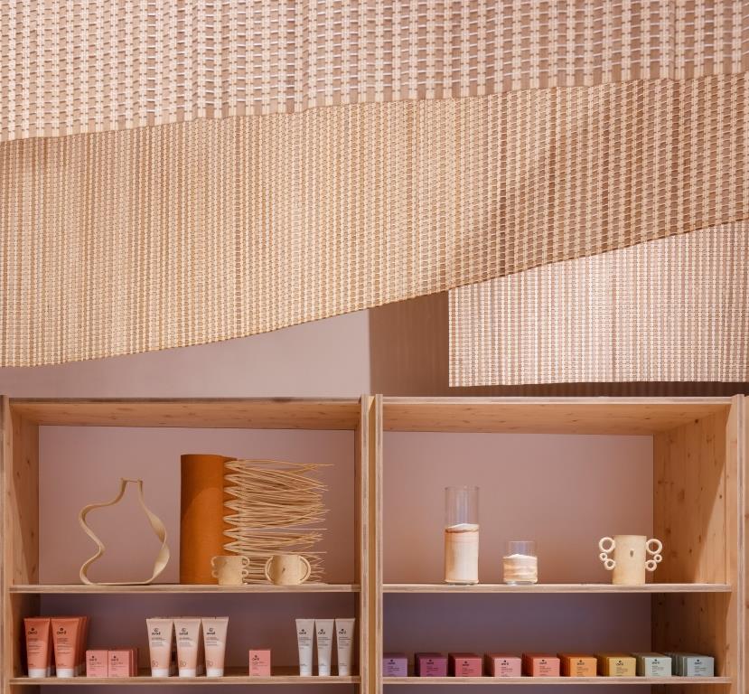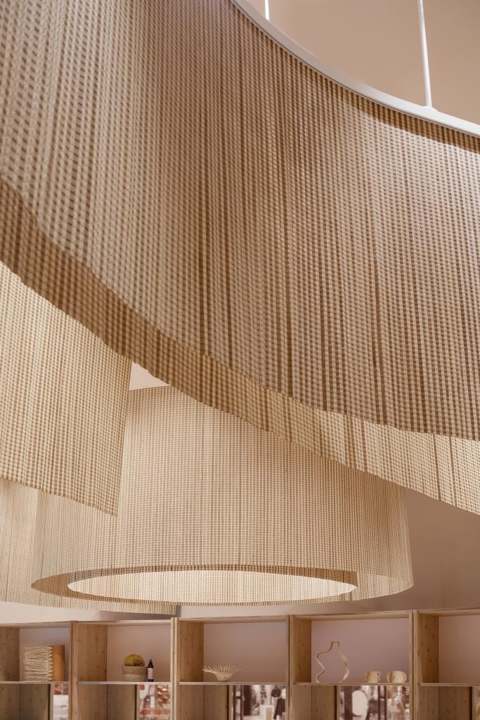 Infine, le fibre naturali sono le protagoniste della boutique all’interno del centro commerciale Aéroville a Roissy-en France. Uno spazio a pianta circolare e a doppia altezza, nel quale grandi stuoie intrecciate in fibra di bambù pendono dal soffitto e danno vita a un’originale composizione di spirali che partendo dal centro si diffondono e ritmano lo spazio. Forme organiche e circolari riecheggiate dal grande display in legno che ripercorre tutta la circonferenza dello store.