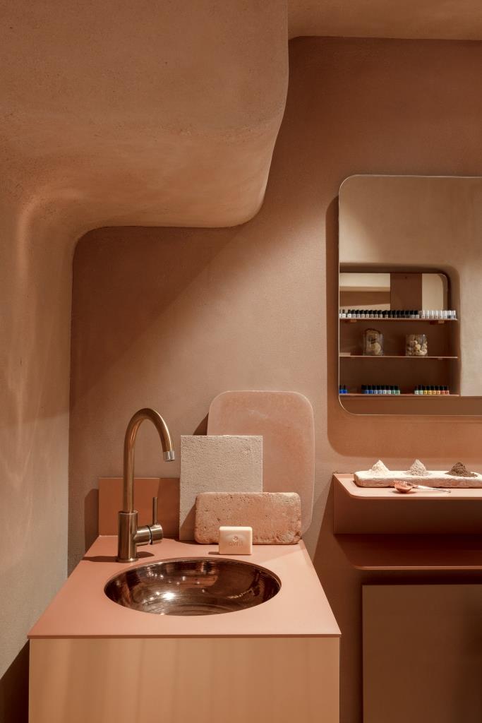 Mentre per l’interior design vero e proprio, Atelier Du Pont ha scommesso su un materiale naturale differente per ogni store, attorno al quale ruota la selezione di arredi e colori. Così lo shop di Rue Montparnasse, nel cuore di Parigi, scommette sulla terra e sulle sue sfumature polverose che vanno dal rosa cipria alla tonalità dell’argilla.