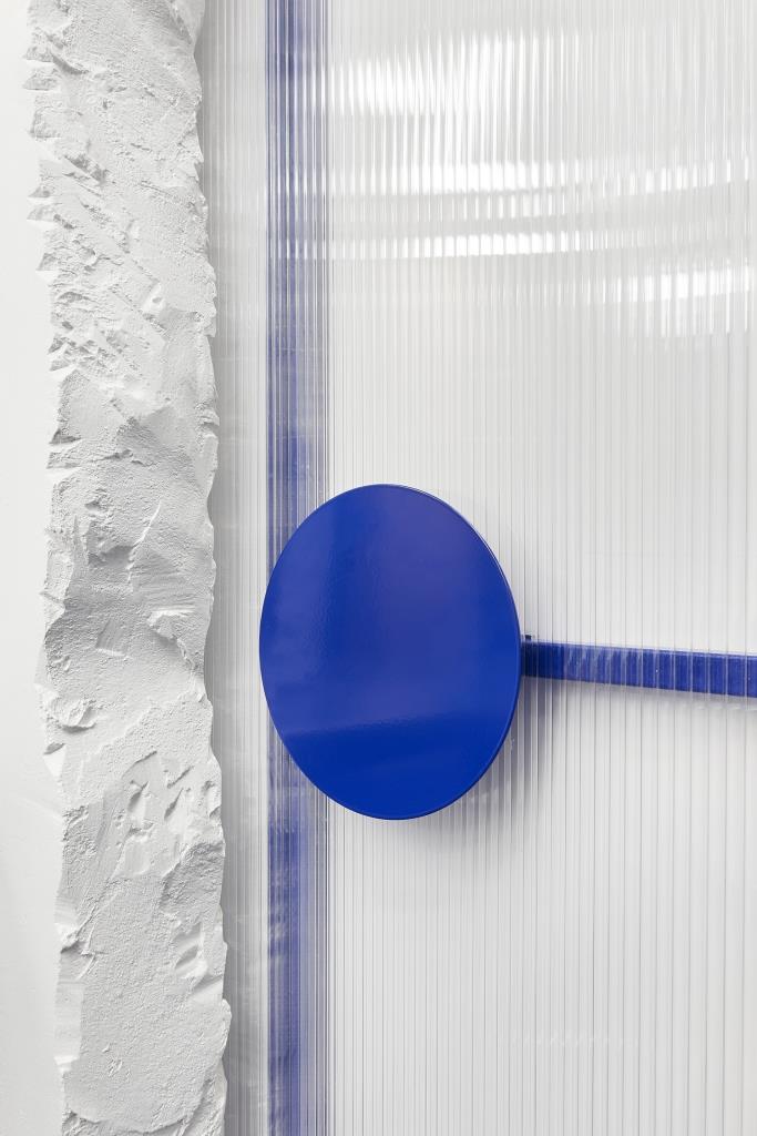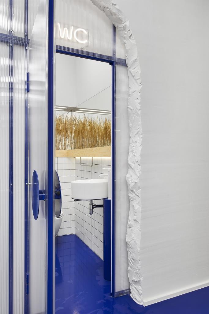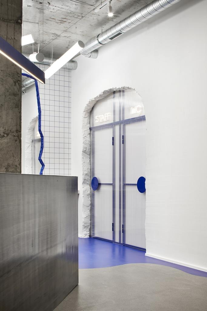Le pareti bianche fanno da sfondo ai blocchi funzionali, mentre il blu è riproposto negli arredi, a pavimento, nei profili metallici e nelle fughe delle piastrelle. Mentre il policarbonato alveolare trasparente è impiegato per pannellare le porte e il banco reception.
