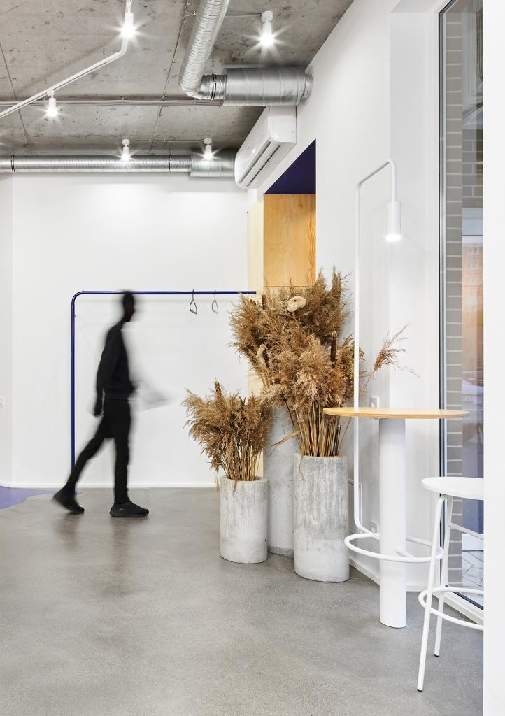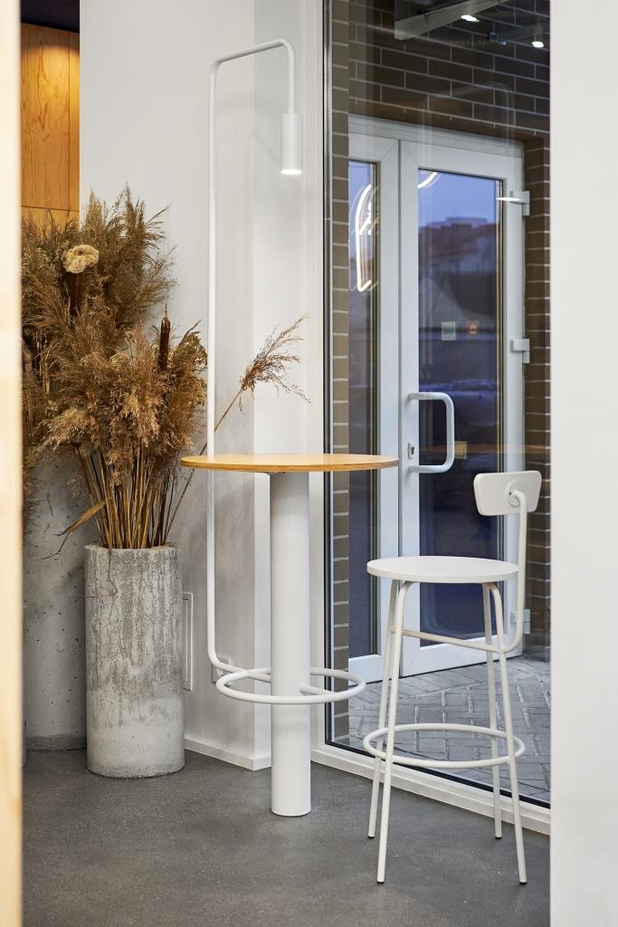 Il benessere di clienti e lavoratori è l’obiettivo che spinge i progettisti a liberarsi di ogni riferimento alla decorazione tradizionale per puntare su interni minimal senza rinunciare al colore. Uno spazio di 68 metri quadrati non facile, composto da un unico ambiente dal perimetro irregolare interrotto da due pilastri centrali e da due sporgenze, che in qualche modo favoriscono una suddivisione in due zone.