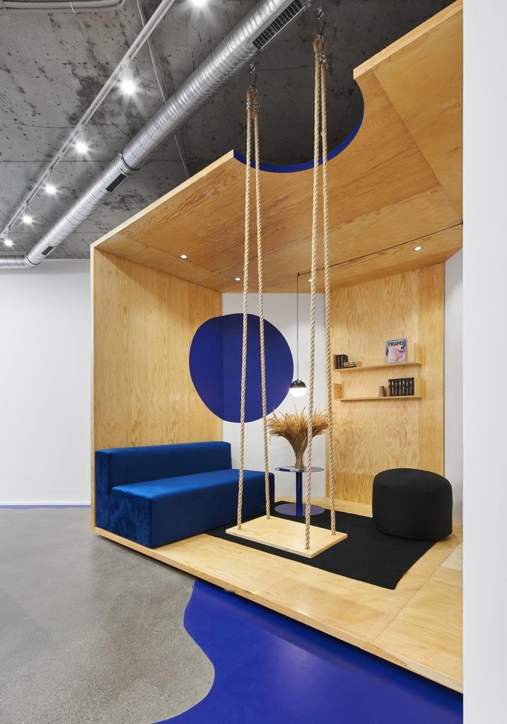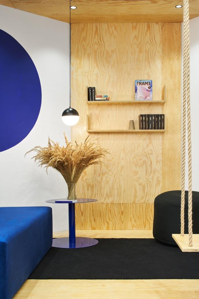 La geometria triangolare del banco della reception ingloba i pilastri e separa la zona comune da quella di lavoro, grazie anche alla realizzazione di un mobile contenitore a tutt’altezza. Di fianco alla reception, la sala d’attesa è un volume in compensato di larice aperto su un lato, una sorta di “spazio nello spazio” che aggiunge un tono caldo e ludico al mood del negozio.