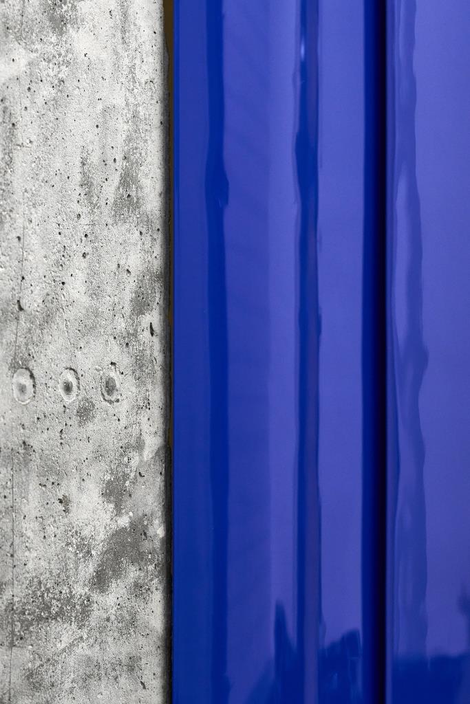 L’approccio alla scelta dei materiali è semplice: cemento, acciaio, piastrelle 10×10, il bianco e il blu creano un’atmosfera fredda e asettica, controbilanciata dal calore del compensato di larice naturale.