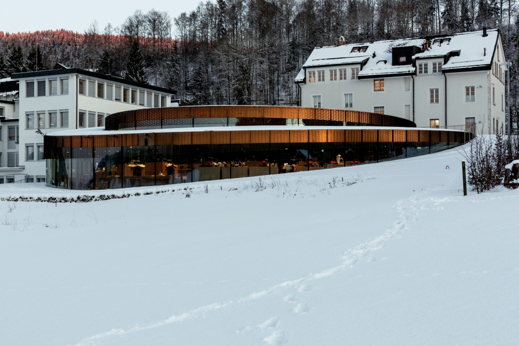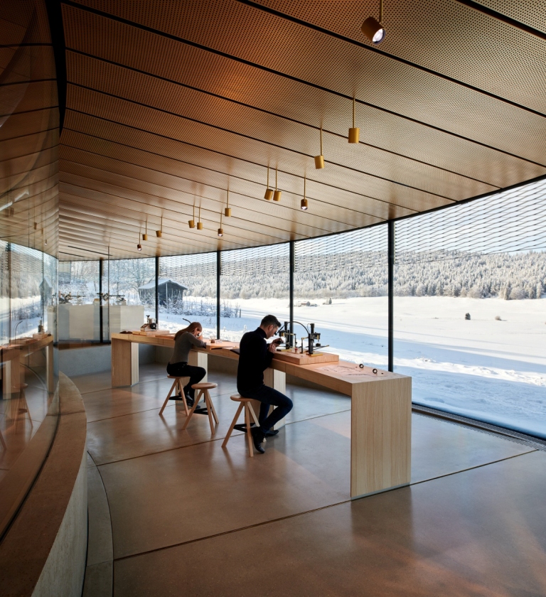 Una parete di vetro curva sostiene direttamente una copertura verde e delimita un percorso che, partendo dalla sede storica della maison, scende in senso orario per poi risalire in senso inverso. Il rapporto con la valle di Joux è intenso e regolato da uno schermo in ottone traforato che accompagna lo sviluppo esterno del padiglione.