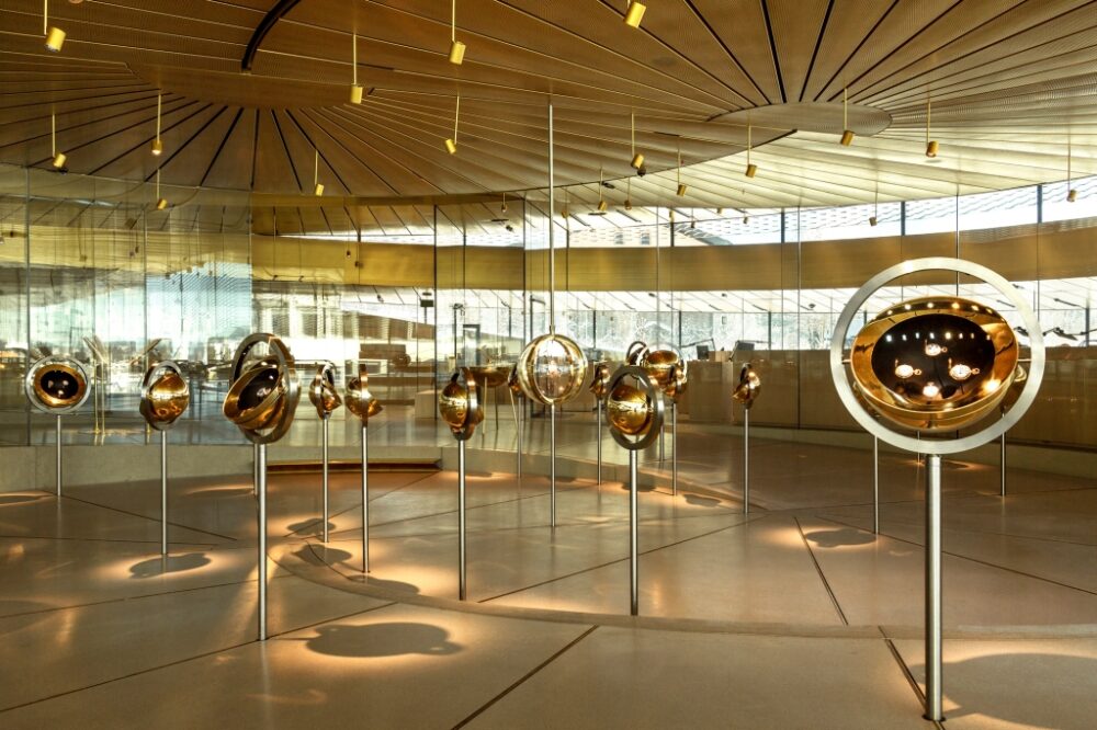L’allestimento è stato curato da Atelier Brückner e si articola in dieci sezioni. Al centro della spirale, nella sezione Complicazioni, si trovano gli elementi più sorprendenti della collezione, fra cui Universale l’orologio più complicato che Audermars Piguet abbia mai creato, esposto in una sfera di vetro che permette di ammirarne entrambe le facce.