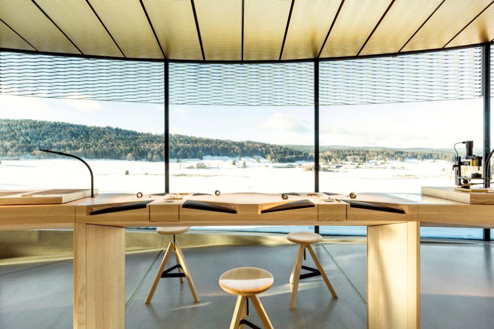 Una parete di vetro curva sostiene direttamente una copertura verde e delimita un percorso che, partendo dalla sede storica della maison, scende in senso orario per poi risalire in senso inverso. Il rapporto con la valle di Joux è intenso e regolato da uno schermo in ottone traforato che accompagna lo sviluppo esterno del padiglione.
