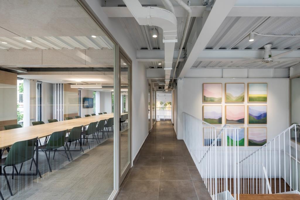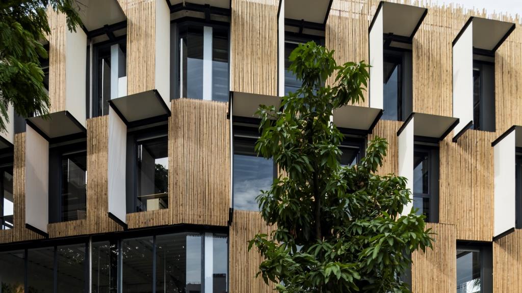 T3 ha lavorato in collaborazione con ingegneri esperti in efficienza energetica per rendere l’edificio sostenibile: la struttura principale esistente è stata mantenuta e a questa è stata affiancata una seconda pelle in bambù, materiale che offre protezione solare e mantiene fresche le pareti.