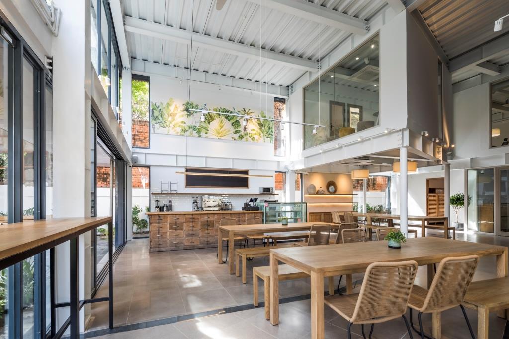 Essenziale per progettisti e cliente infondere buone vibrazioni dal primo momento in cui gli utenti entrano nell’edificio, con un’accoglienza degna di un resort, grazie al collegamento diretto con il giardino tropicale, i toni naturali, i materiali di provenienza locale e, dove possibile, ecologici made in Vietnam: bambù, intonaco a calce, legno massello, pietra locale e solo piante autoctone.