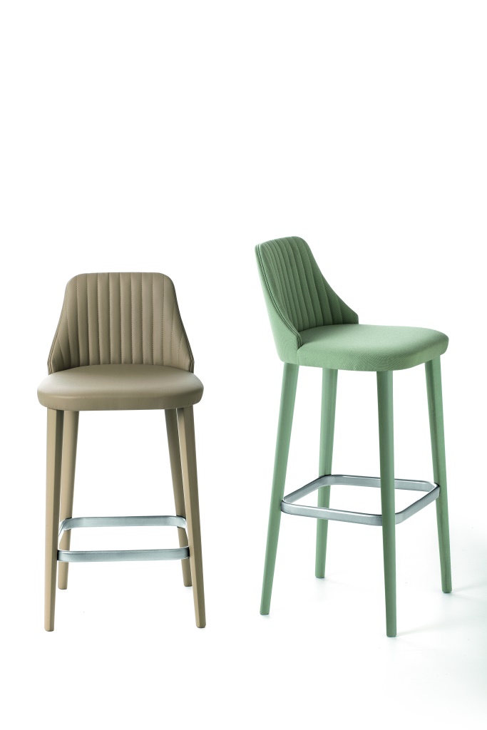 Nora, invece, propone un design in cui la struttura in legno massello diventa sia segno funzionale che identitario. Le gambe posteriori in frassino naturale, tinto o laccato opaco, si estendono infatti sino a definire il profilo inferiore del bracciolo, con una duplice valenza decorativa e funzionale. La scocca, imbottita e rivestita in pelle o tessuto, è impreziosita da cuciture tono su tono o a contrasto.