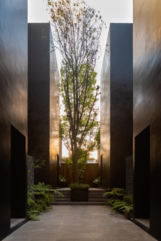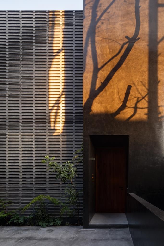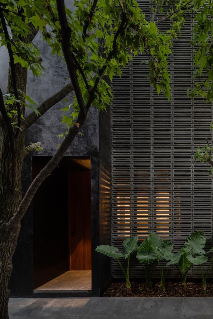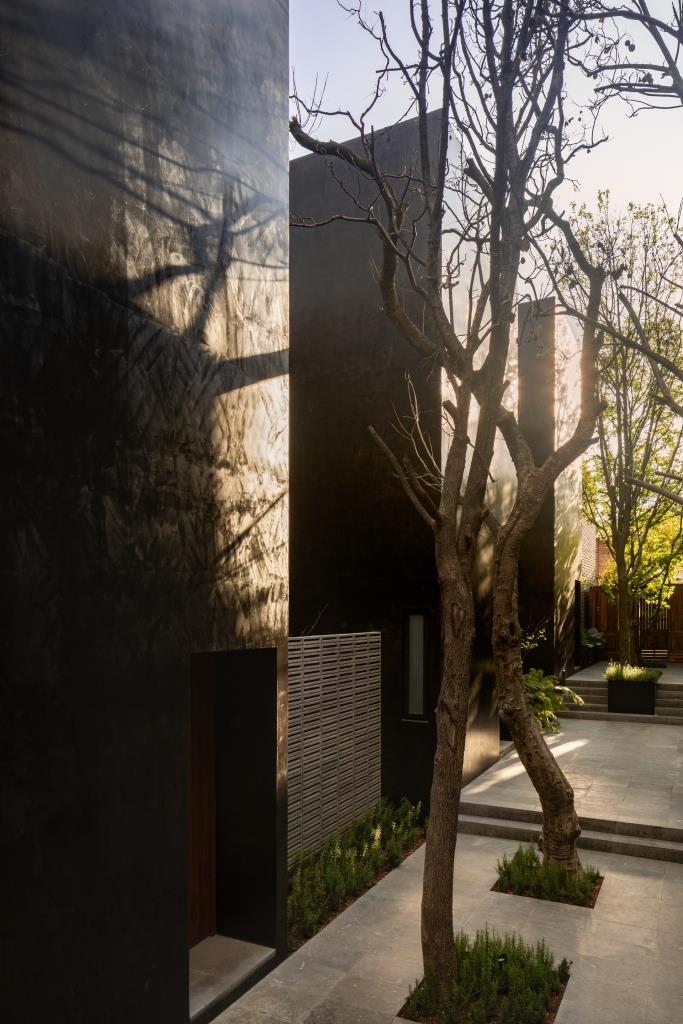 Ognuno degli edifici, distribuiti in due gruppi di quattro sui lati che costeggiano il viale interno, è infatti dotato di giardini privati protetti alla vista da griglie in calcestruzzo che lasciano la luce naturale filtrare liberamente.