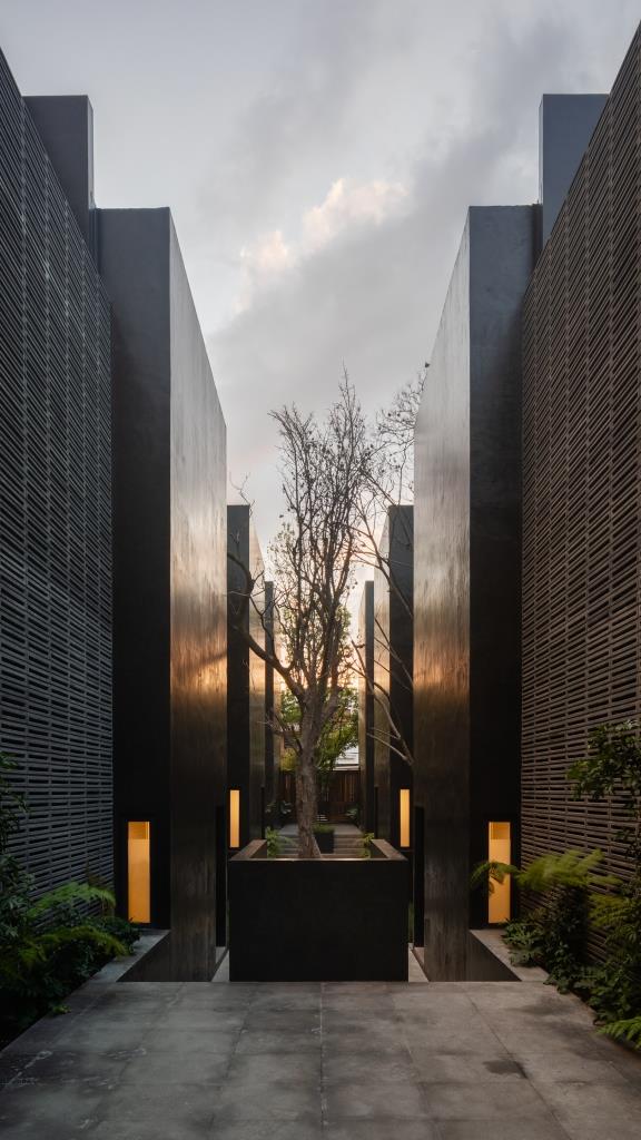 Otto edifici, disposti intorno a un percorso interno pavimentato in pietra e piantumato con alberi, che alternano volumi monolitici neri e paramenti grigliati in cemento.