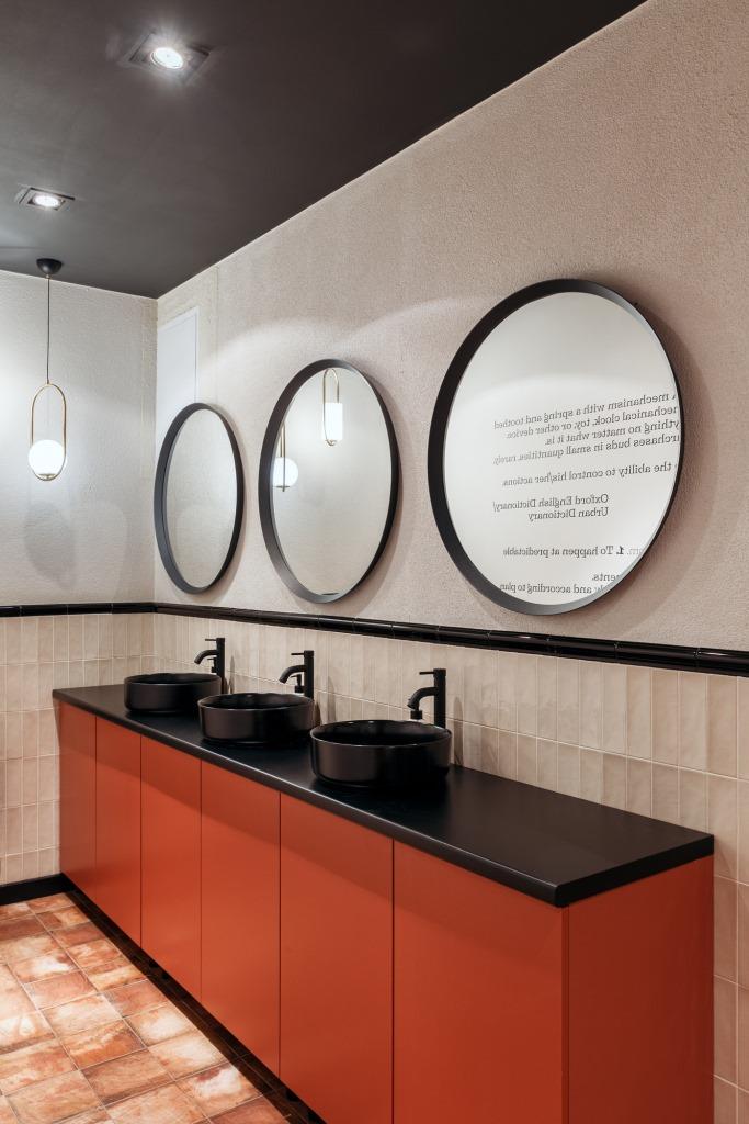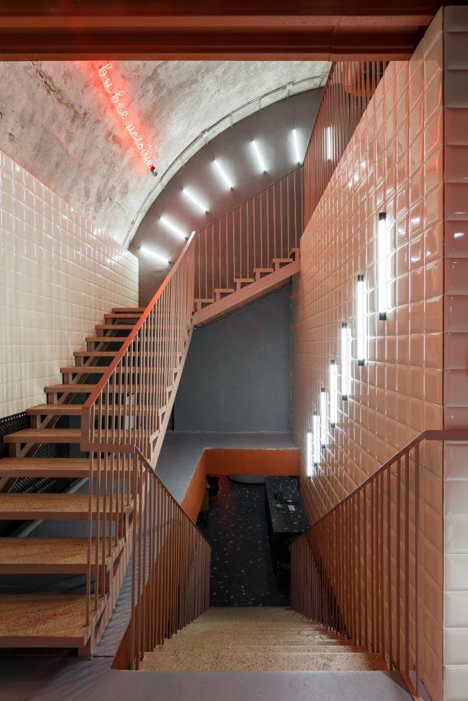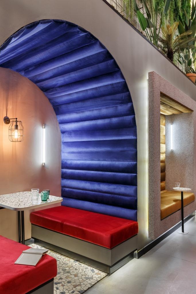 Fermo restando il contenitore con le sue intrinseche caratteristiche industriali evidenti soprattutto nel cemento a vista delle volte e negli impianti che corrono a soffitto, le nuove partizioni verticali e gli elementi decorativi cercano un contrappunto attraverso geometrie morbide, forme ad arco, texture e colori a contrasto. Le superfici sono dipinte nei toni del blu, terracotta, verde scuro e beige, con rivestimenti in gres lucido in vari formati.
