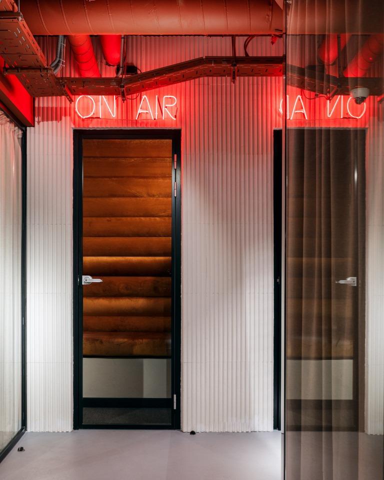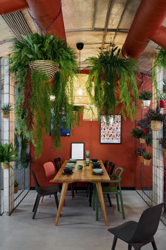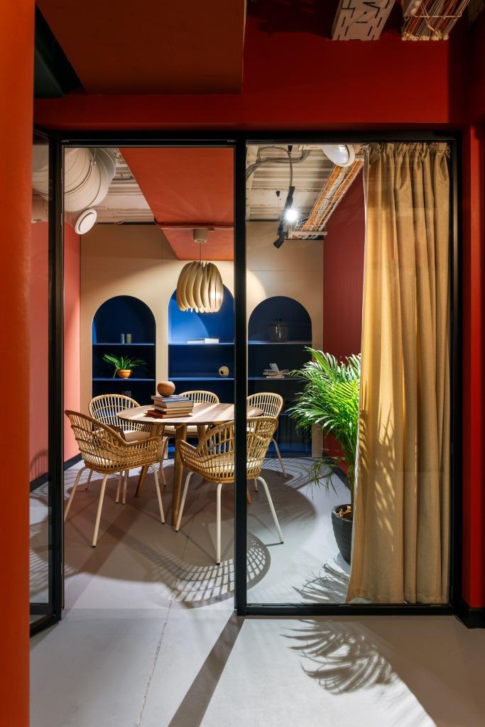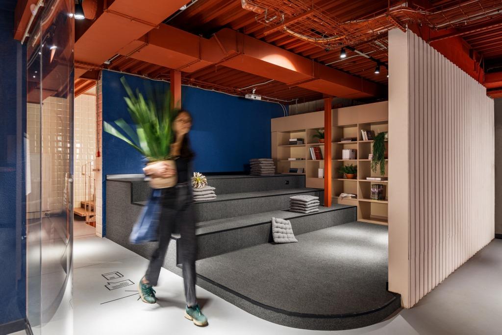 Alcuni mobili e complementi sono realizzati da artigiani locali in esclusiva, come per esempio i piani da lavoro in cemento con incrostazioni di vetro colorato e le scritte al neon delle zone comuni, che aiutano a orientarsi nei più di 1000 metri quadri di superficie.