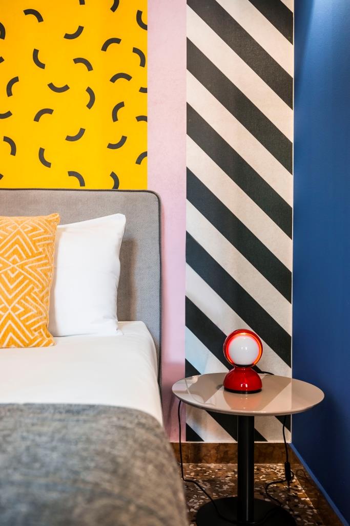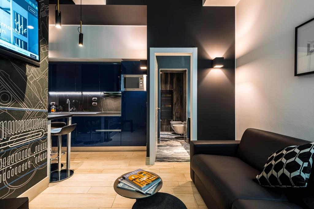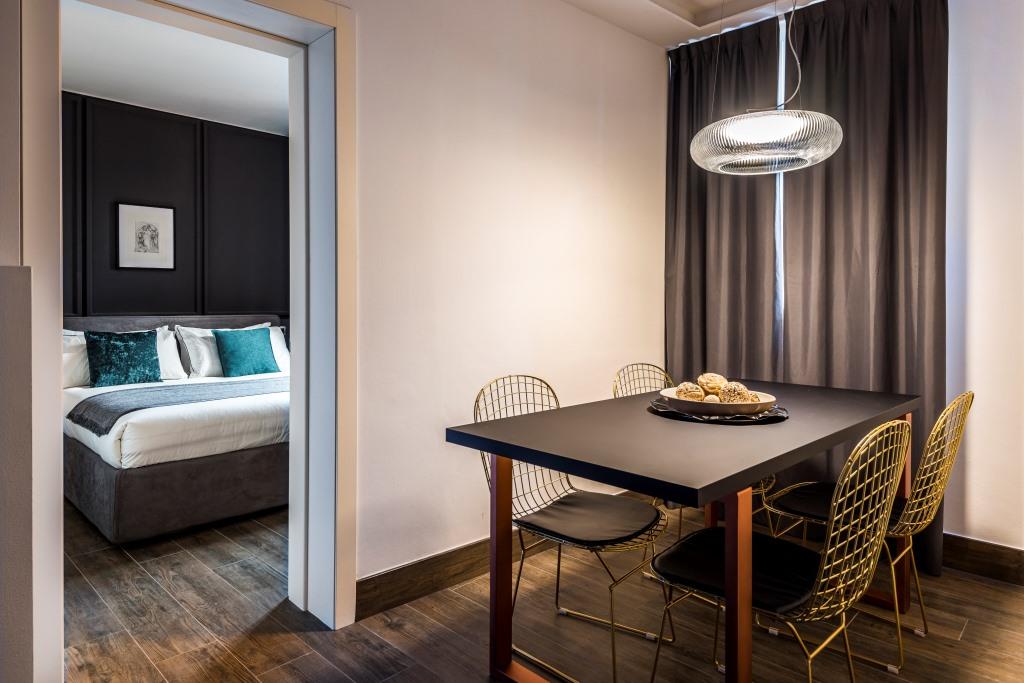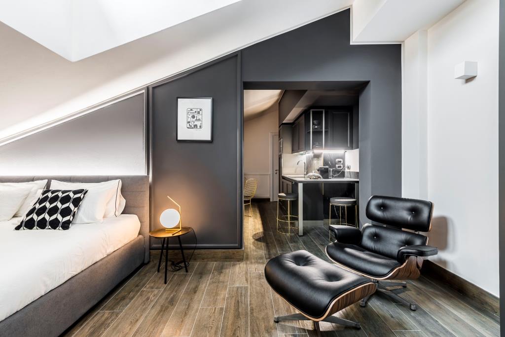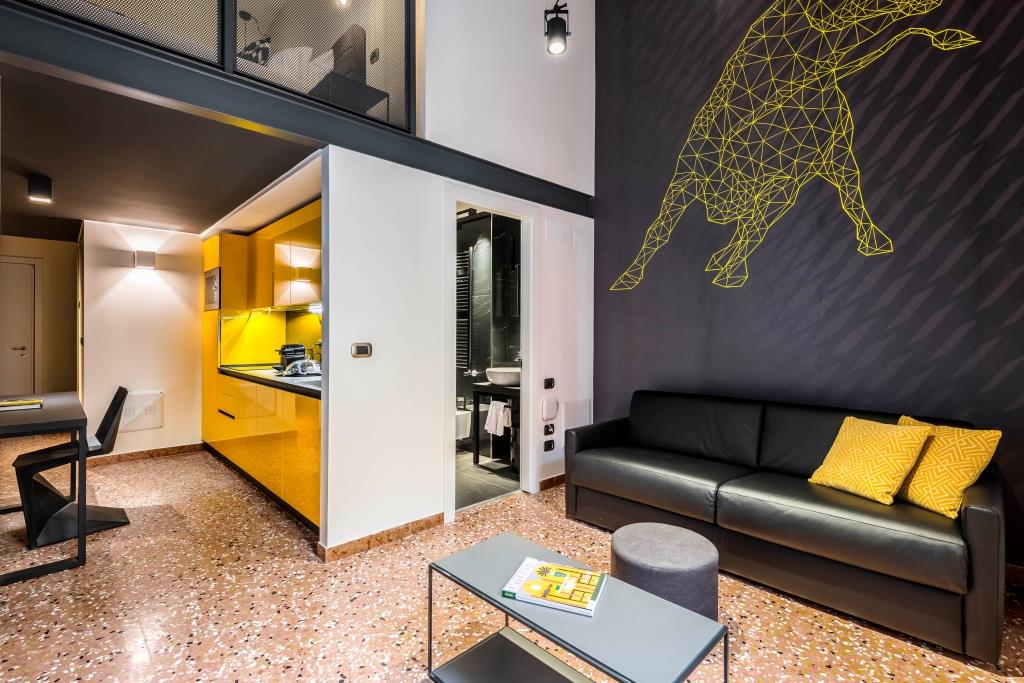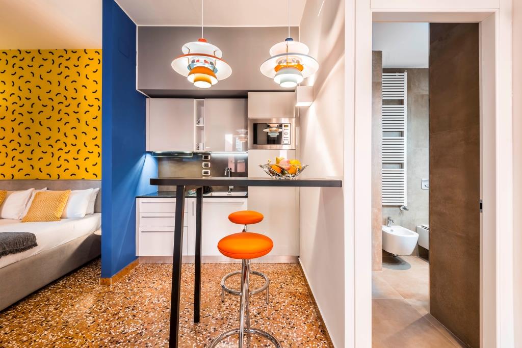All’ultimo piano dell’edificio gli appartamenti in stile Luxury interpretano in chiave contemporanea i caratteri senza tempo dello stile classico, dotati ciascuno di un’attenzione speciale, camini a legna o terrazzi aperti sui tetti del centro storico e vasche Jacuzzi a pavimento. Eighties&Bolidism riprende lo stile degli anni ‘80 nelle varie sfaccettature, miscelando oggetti di design, come lo sgabello Guizzo della collezione Dinamic prodotto da Moroso, del movimento Memphis e del Bolidismo, ed esaltando i colori e le forme che hanno generato l’estetica post-modern di quegli anni.