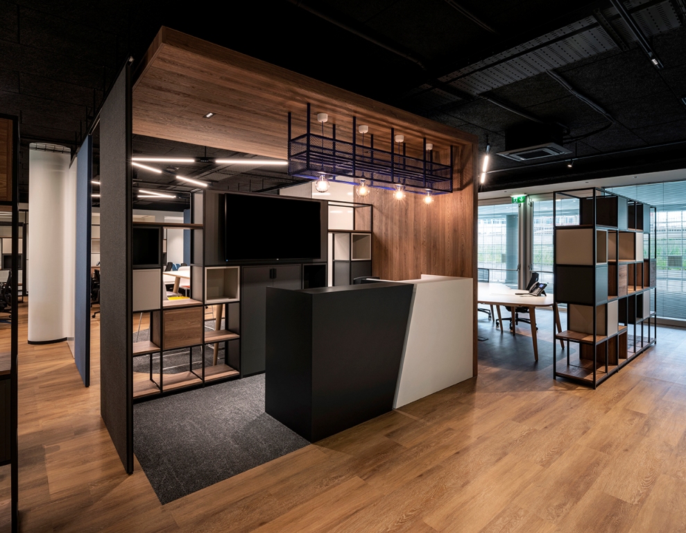L’open-space è circondato da aree di supporto concepite per le esigenze di concentrazione e di lavoro individuale, per meeting e riunioni riservate. Informal meeting, phone boot e una sala meeting per sei persone con altri spazi concepiti come office&meet riservati. La trasparenza connota gli ambienti attraverso l’uso di pareti vetrate con struttura metallica a vista in stile industrial. L’ambiente centrale aperto è protetto da un sistema di binari sospesi dotati di pannelli fonoassorbenti scorrevoli e scrivibili in laminato e in tessuto.