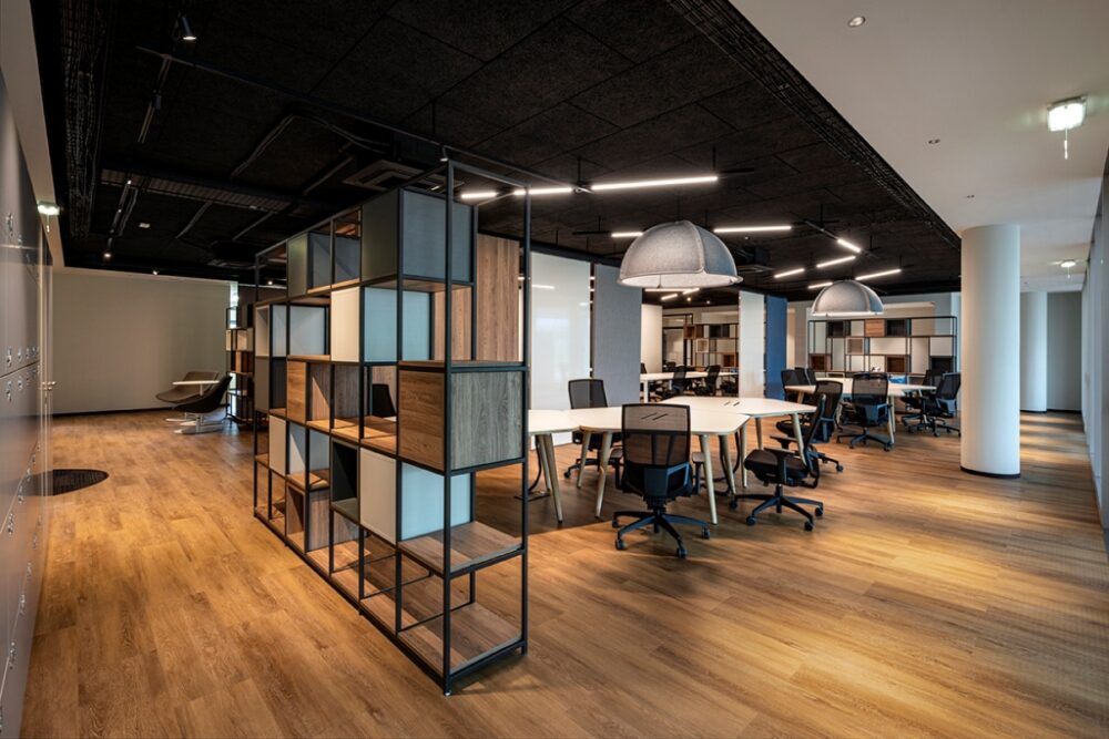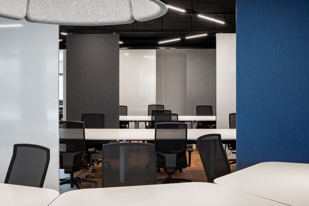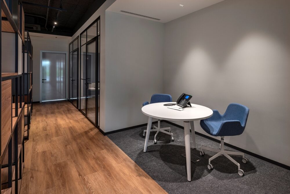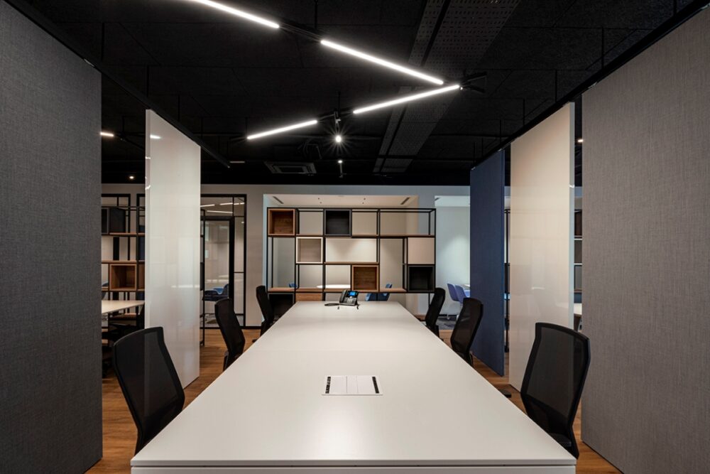 L’open-space è circondato da aree di supporto concepite per le esigenze di concentrazione e di lavoro individuale, per meeting e riunioni riservate. Informal meeting, phone boot e una sala meeting per sei persone con altri spazi concepiti come office&meet riservati. La trasparenza connota gli ambienti attraverso l’uso di pareti vetrate con struttura metallica a vista in stile industrial. L’ambiente centrale aperto è protetto da un sistema di binari sospesi dotati di pannelli fonoassorbenti scorrevoli e scrivibili in laminato e in tessuto.