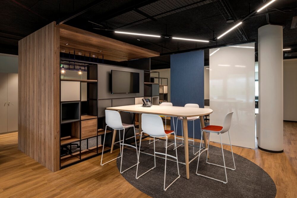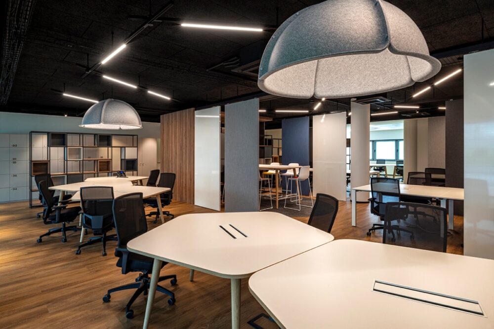 Gli ospiti sono accolti dalla reception progettata da DEGW in bianco e nero in materiale ligneo di prima qualità laccato, sormontato da strutture metalliche blu custom che diventano dei veri e propri contenitori di luci e verde naturale. Ai classici tavoli fissi si affiancano tavoli pentagonali riconfigurabili che formano le “team area”, le zone dedicate al lavoro collaborativo, illuminate da lampade pedinate puntuali con cupole in tessuto acustico di Ateljé Lyktan.