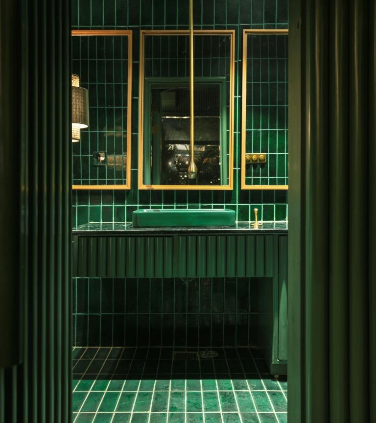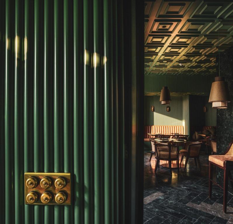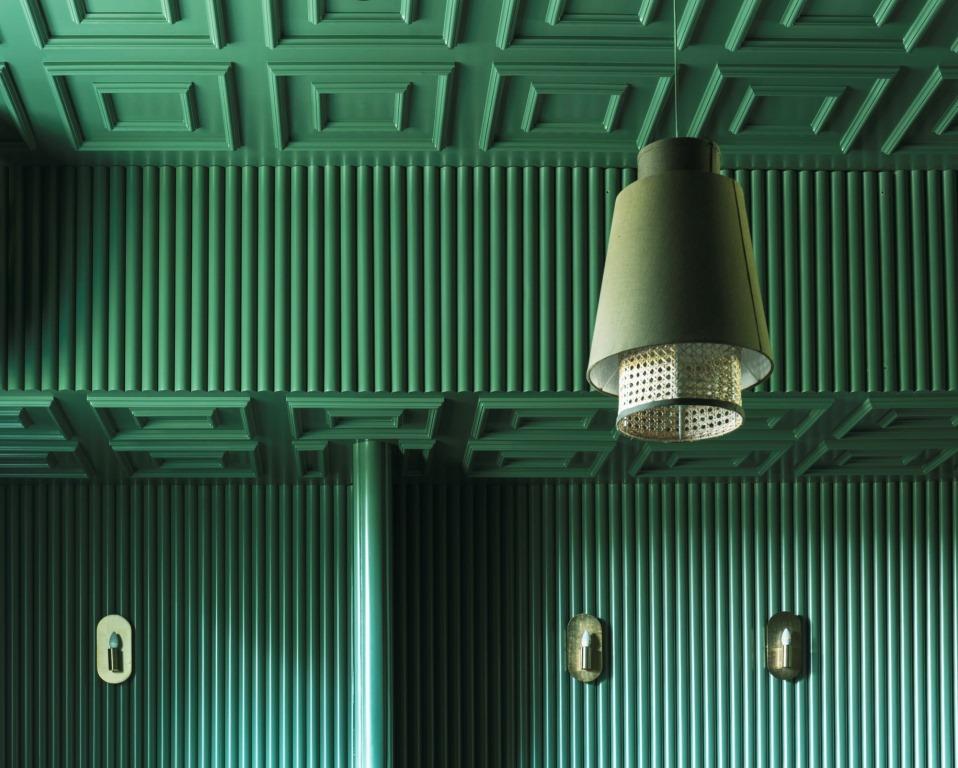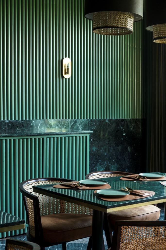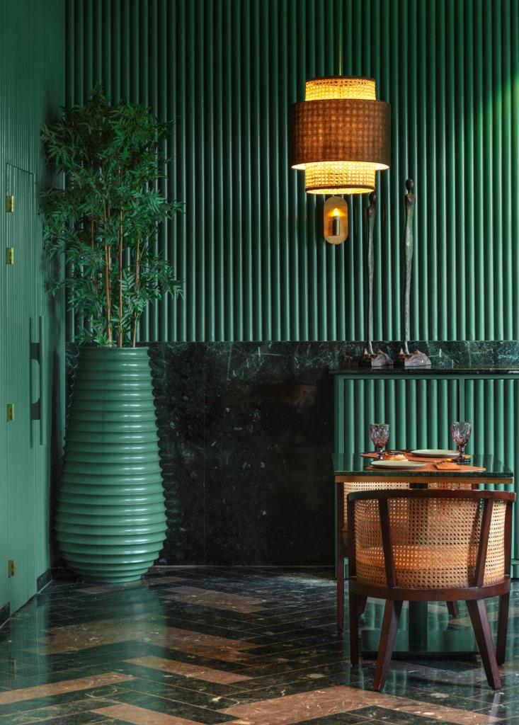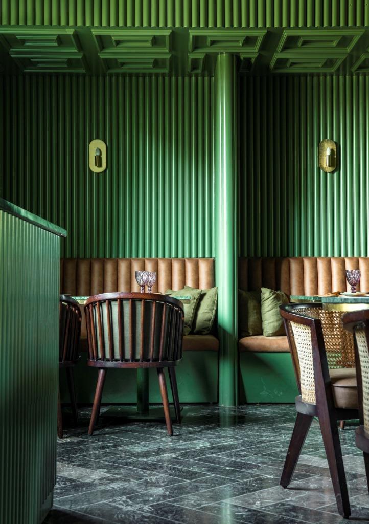 Tutti i materiali utilizzati sono di provenienza locale, con una netta prevalenza della pietra di Udaipur con le sue suggestive venature verdi, cui fa da contrasto il rosa salmone di sedute connotate dalle morbide curve degli imbottiti. Arredi e corpi illuminanti sono stati coordinati sia nei tessuti che nei materiali e nei colori, presenti nelle delicate sfumature dorate di applique e cornici. Alla loro morbidezza fa creativamente contrasto il rigore dei soffitti in legno a cassettoni, declinati secondo un motivo geometrico che ricorre in tutti gli spazi della location e il cui colore verde ricrea un’unità cromatica in cui elementi d’arredo e complementi si impongono all’attenzione dello sguardo.