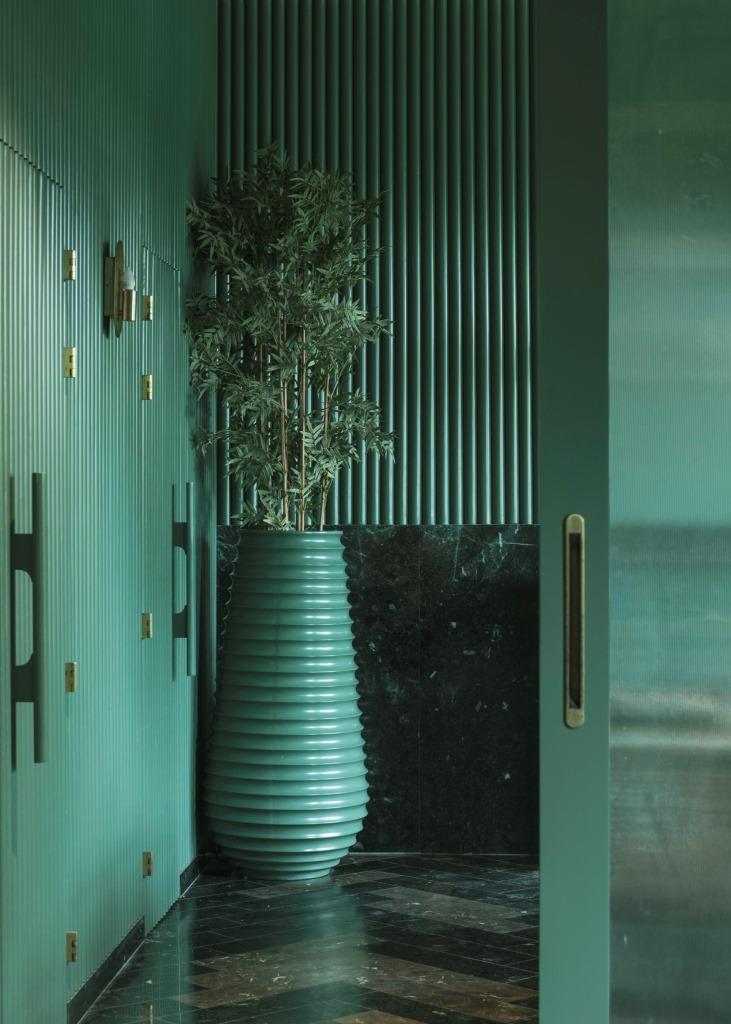 Questa pluralità di funzioni si declina in un interior design che fin dall’ingresso invita gli ospiti all’esplorazione e alla scoperta di spazi vivacizzati da una creativa composizione di materiali, forme e colori. Dalla caffetteria, luogo d’incontro e di conversazione, un ingresso conduce a una sala ristorante privata separata da cortine scorrevoli, mentre un ulteriore percorso porta a un wine bar in cui le bottiglie di vino, poggiate su supporti a parete quasi invisibili, diventano esse stesse elemento decorativo di un ambiente al cui centro trova spazio un grande tavolo in pietra verde contornato da sedute in legno e paglia di Vienna.