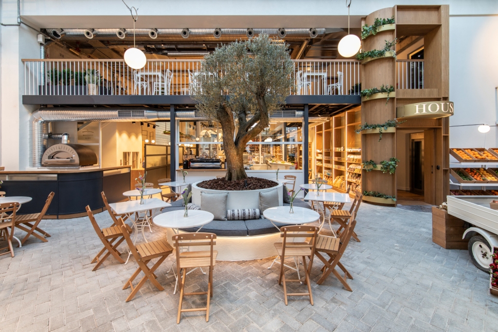Nella piazza, intorno a un ulivo, albero sacro e simbolo della città di Atene, si collocano gli shop gastronomici, il fornaio, il fruttivendolo, una zona con pescheria e macelleria in un atrio a doppia altezza arricchito dai murales di Ino, il visual street artist più importante della Grecia, con un bellissimo fuori scala di Atena arciera e altri bozzetti di figure nere che ricordano l’arte ceramica del periodo classico.