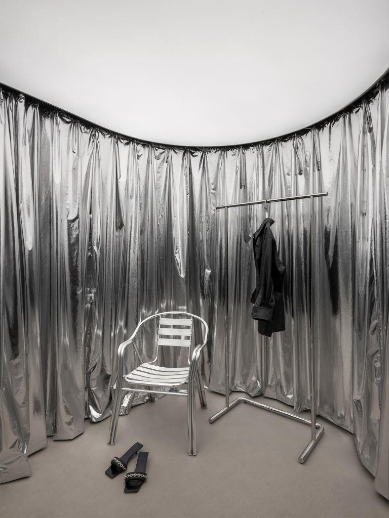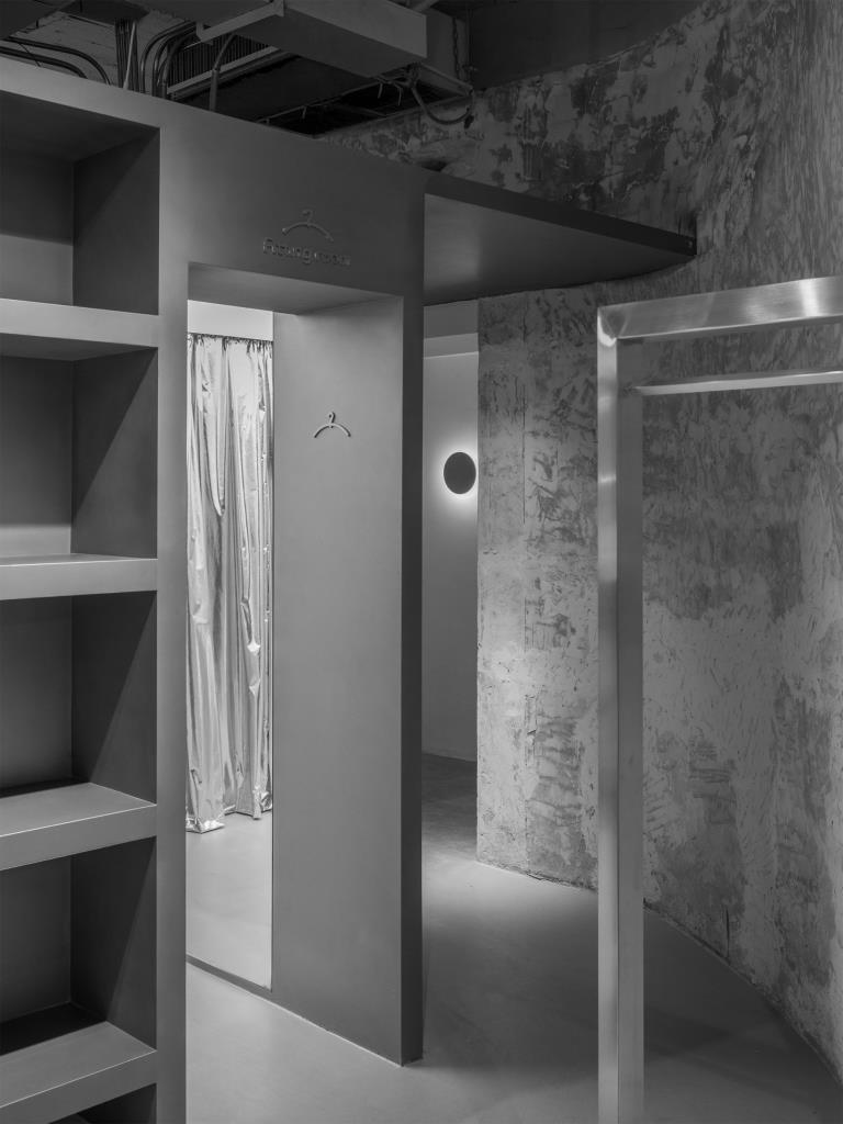 All’interno gli spazi espositivi, un piccolo bar e i camerini confluiscono l’uno dentro l’altro senza interruzioni o pareti divisorie. I muri perimetrali, ripuliti dagli strati di vernice accumulati negli anni, mostrano oggi la loro superficie graffiata e materica. Interessante il contrasto che nasce tra questa patina raw e l’aspetto levigato e lucido di espositori e specchi.