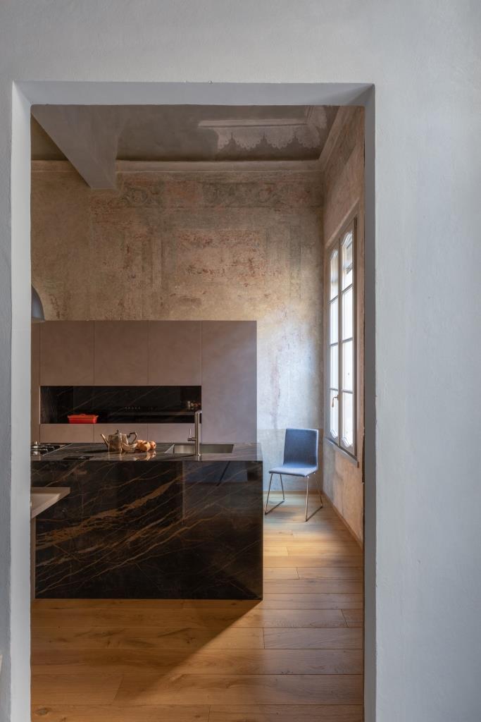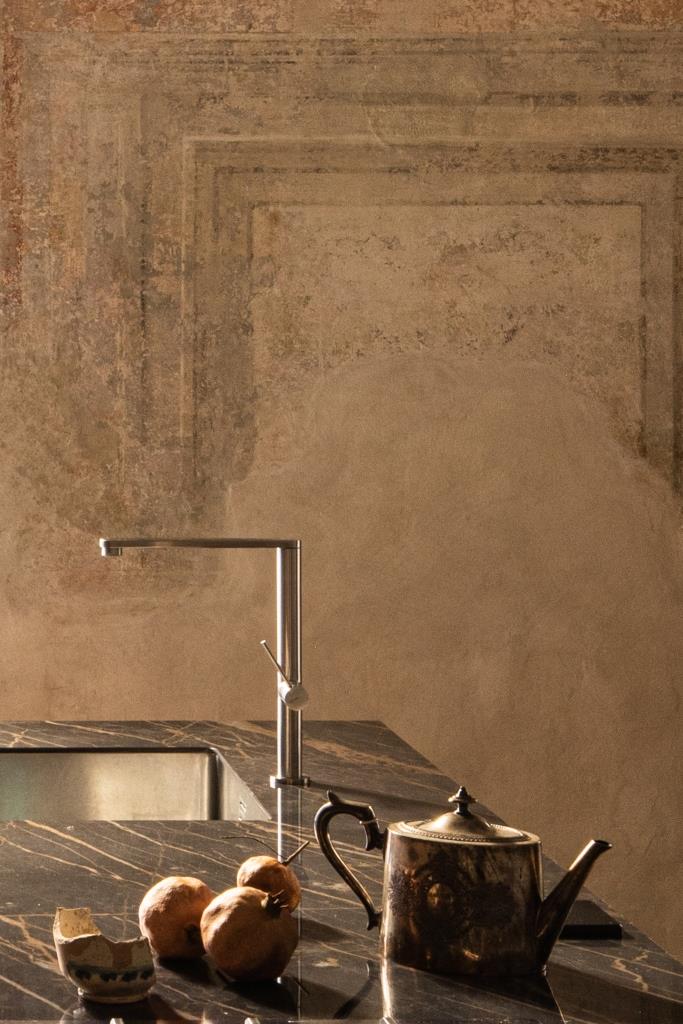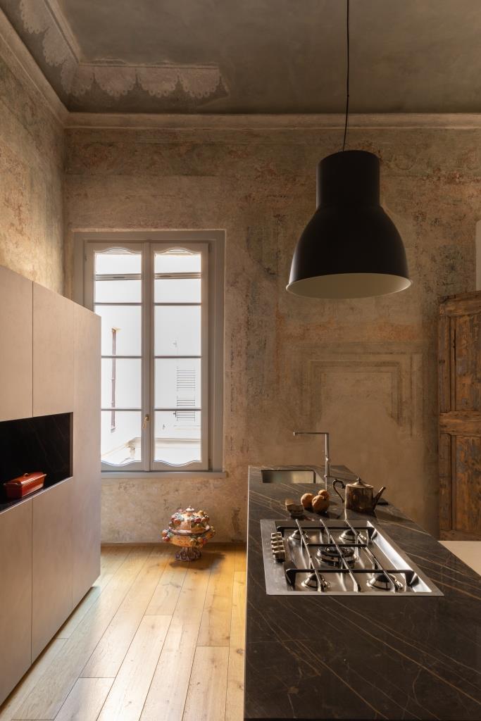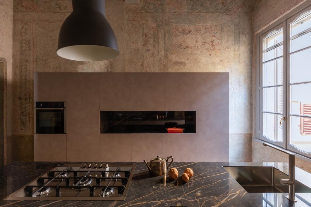 Quanto alla palette di colori, per le pareti si è optato per una cromia neutra, ma dotata di un’identità distintiva, e per vernici a base di silicati, minerali che permettono ai raggi di luce di penetrare direttamente nel pigmento rendendolo cangiante. Anima dell’appartamento è la cucina di Maistri personalizzata ad hoc: in uno spazio elegantemente conviviale, quello che a prima vista sembra marmo è in realtà la lastra ceramica Noir Desir di Laminam, materiale fine e molto resistente.