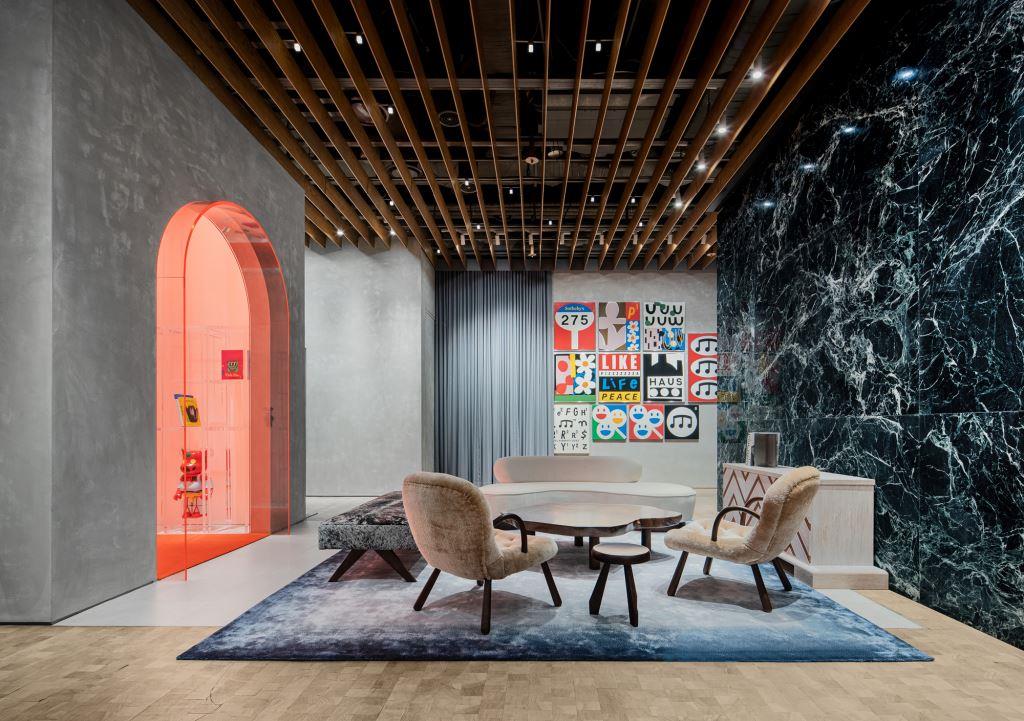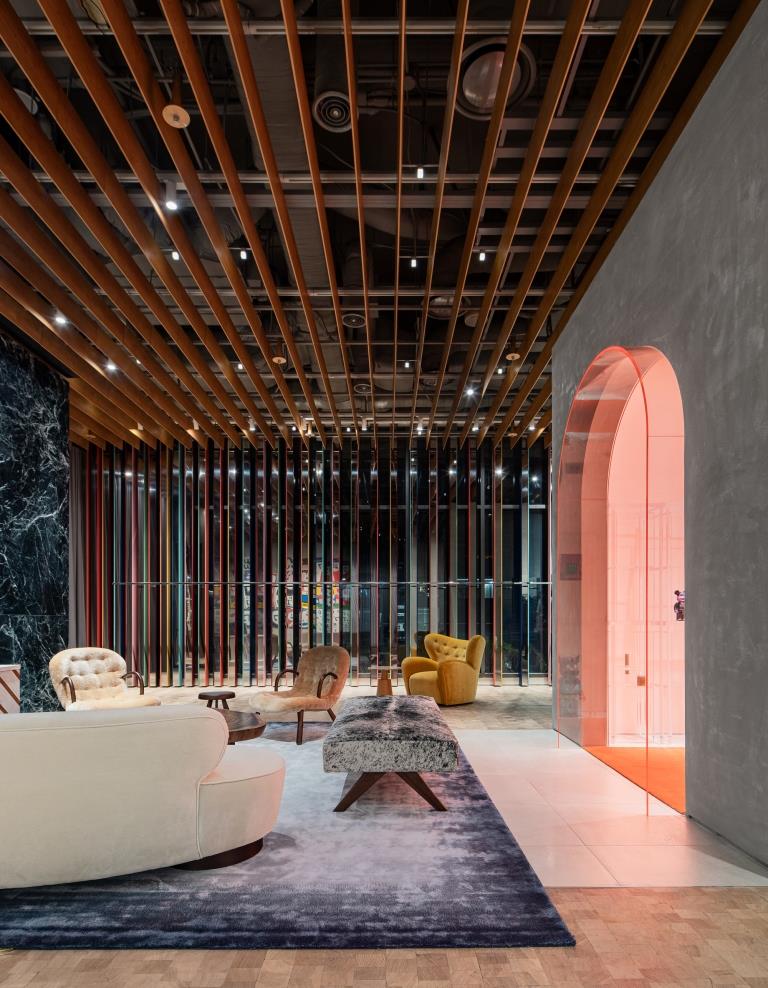 Il contrasto cromatico è forte e si inserisce in una boutique che vede soffitti con assi di legno accostarsi a una moltitudine di specchi e a una zona lounge arredata come un salotto – con poltrone, divani e opere grafiche a rallegrare l’atmosfera – e caratterizzata dalla presenza di una parete di pannelli in marmo e di un’altra in cemento con un passaggio ad arco illuminato.