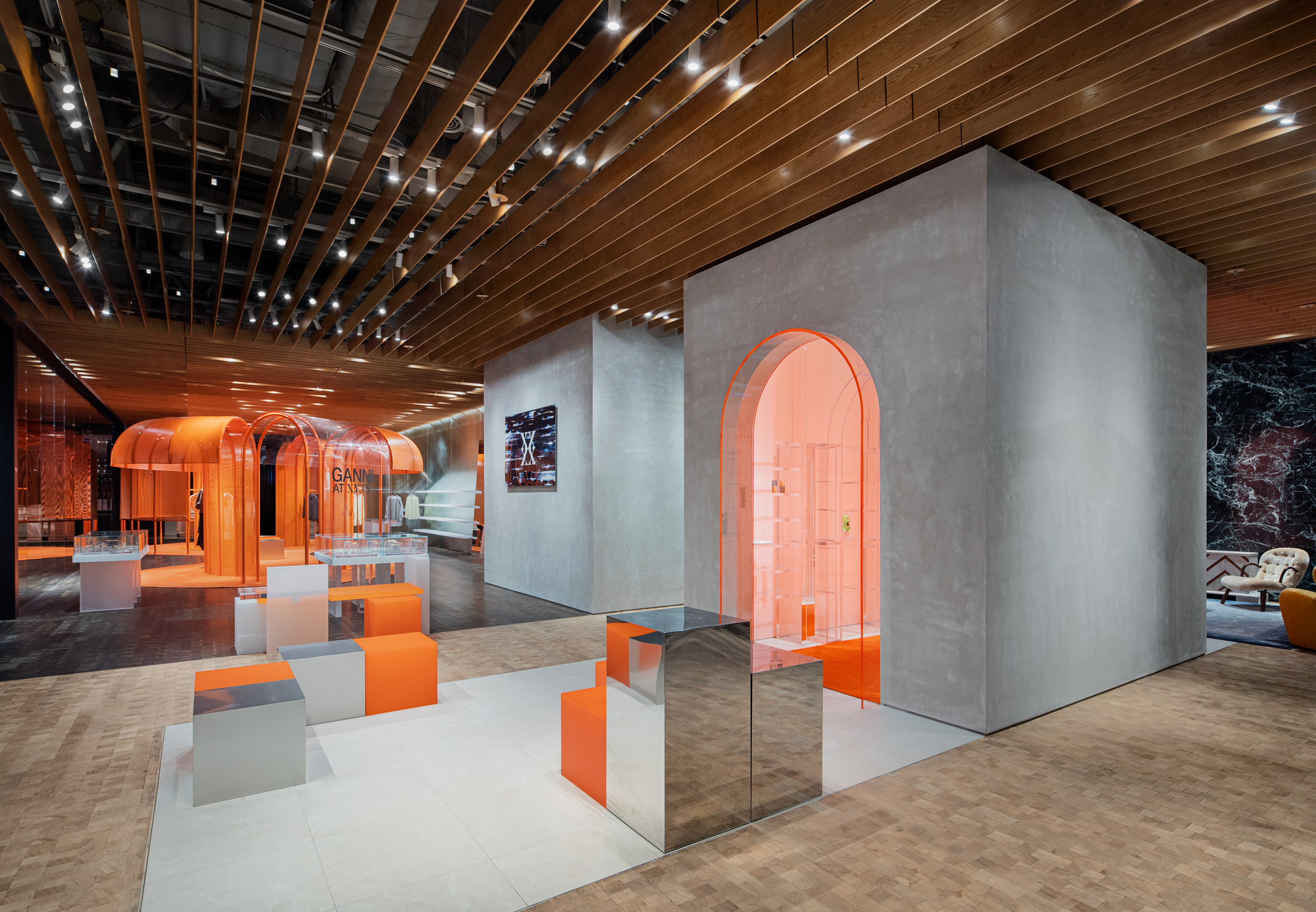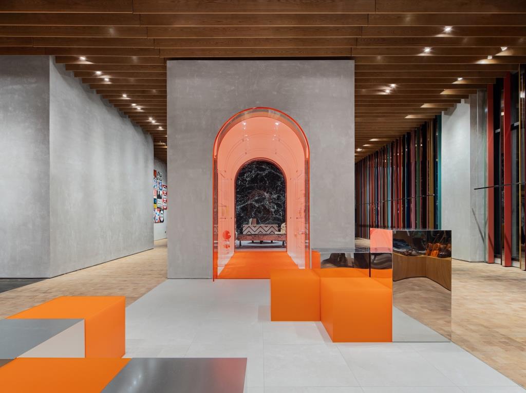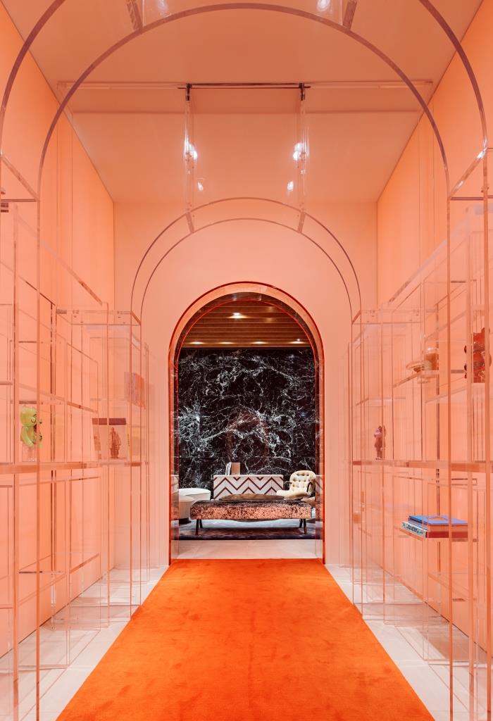 Il risultato è un percorso lungo il quale sfilano mobili, mensole e scaffali in acrilico, dal design semplice e pulito, in arancione ma anche argentati, realizzati su misura in collaborazione con l’artista locale Rahee Yoon.