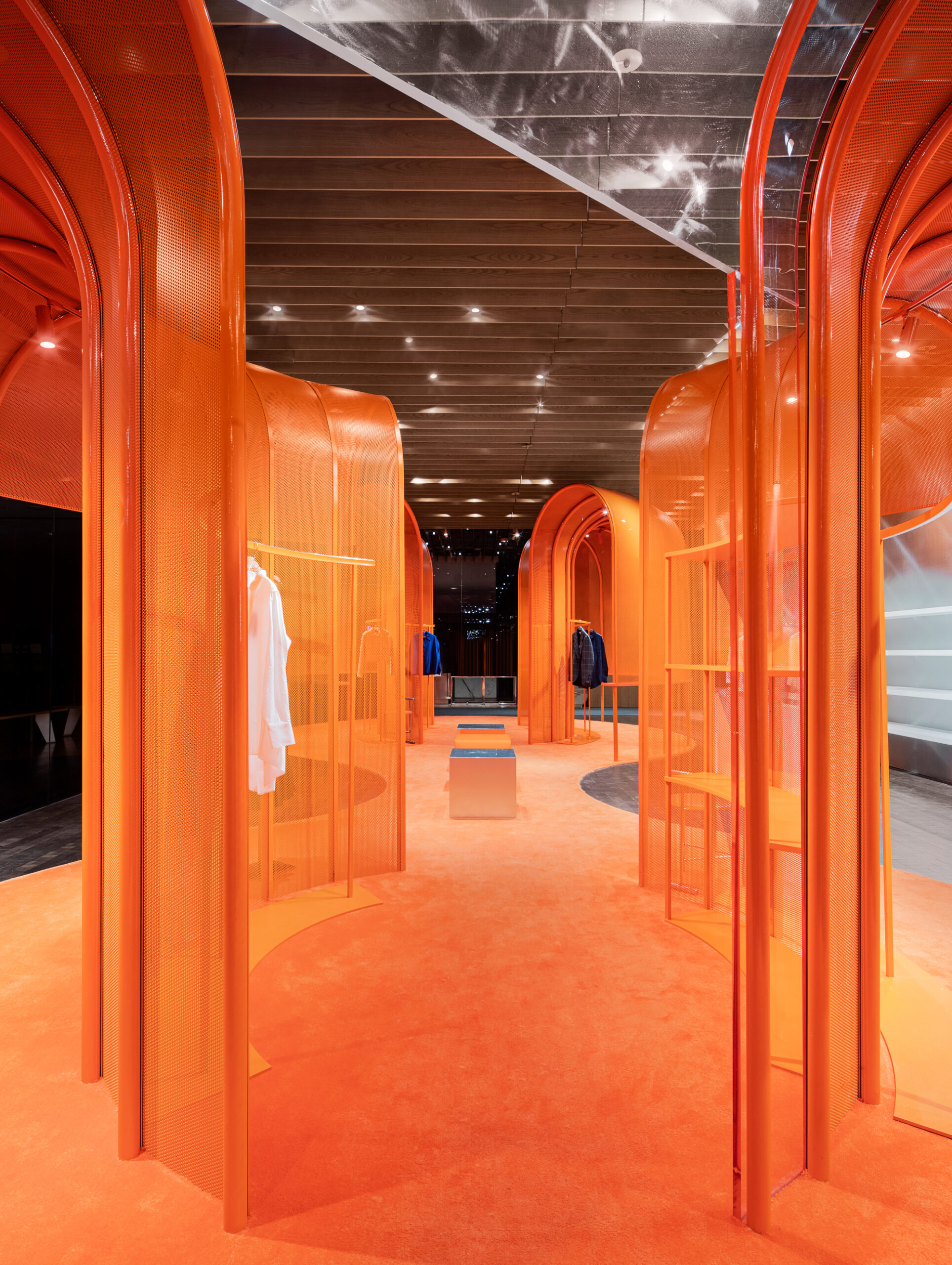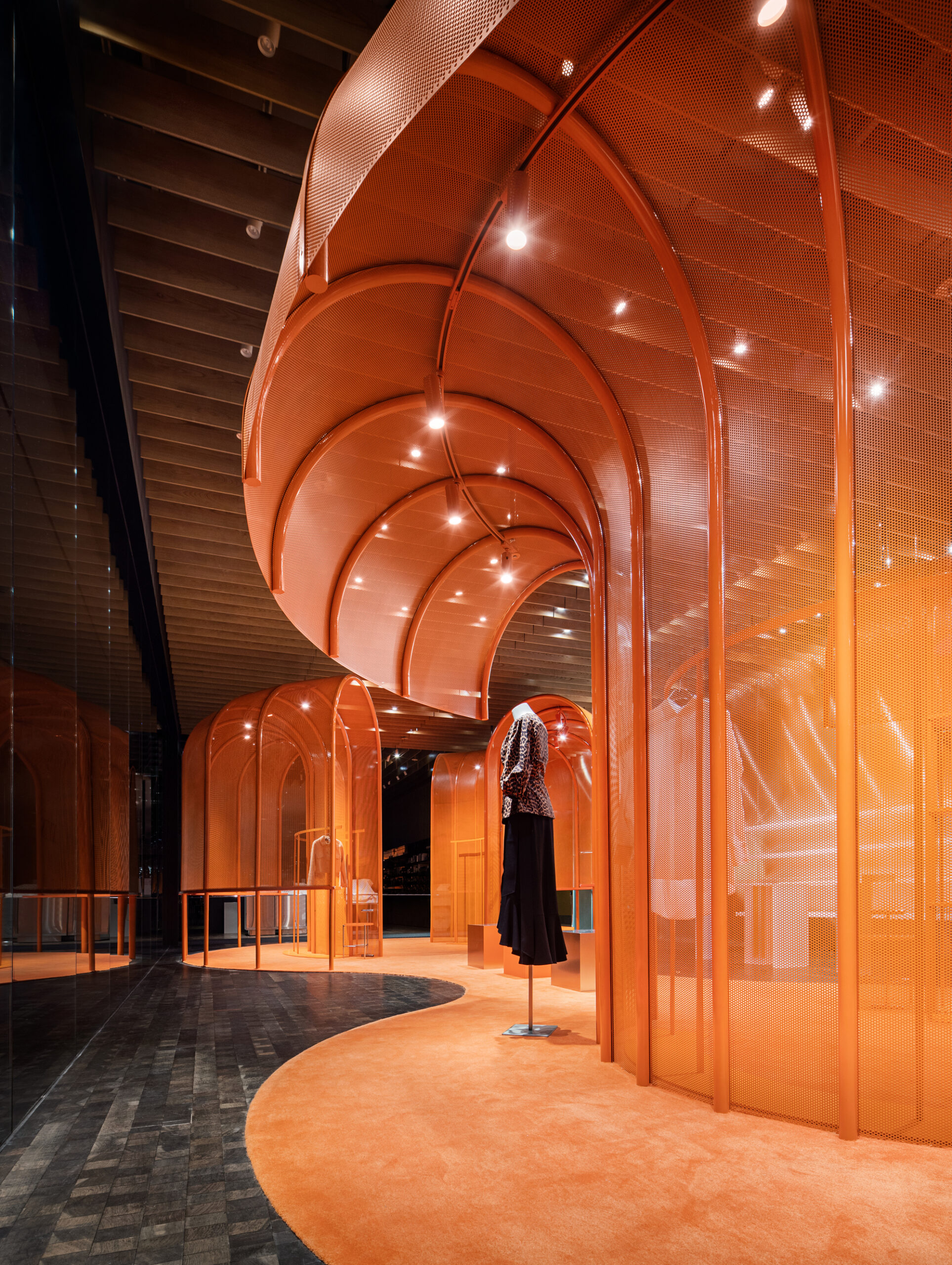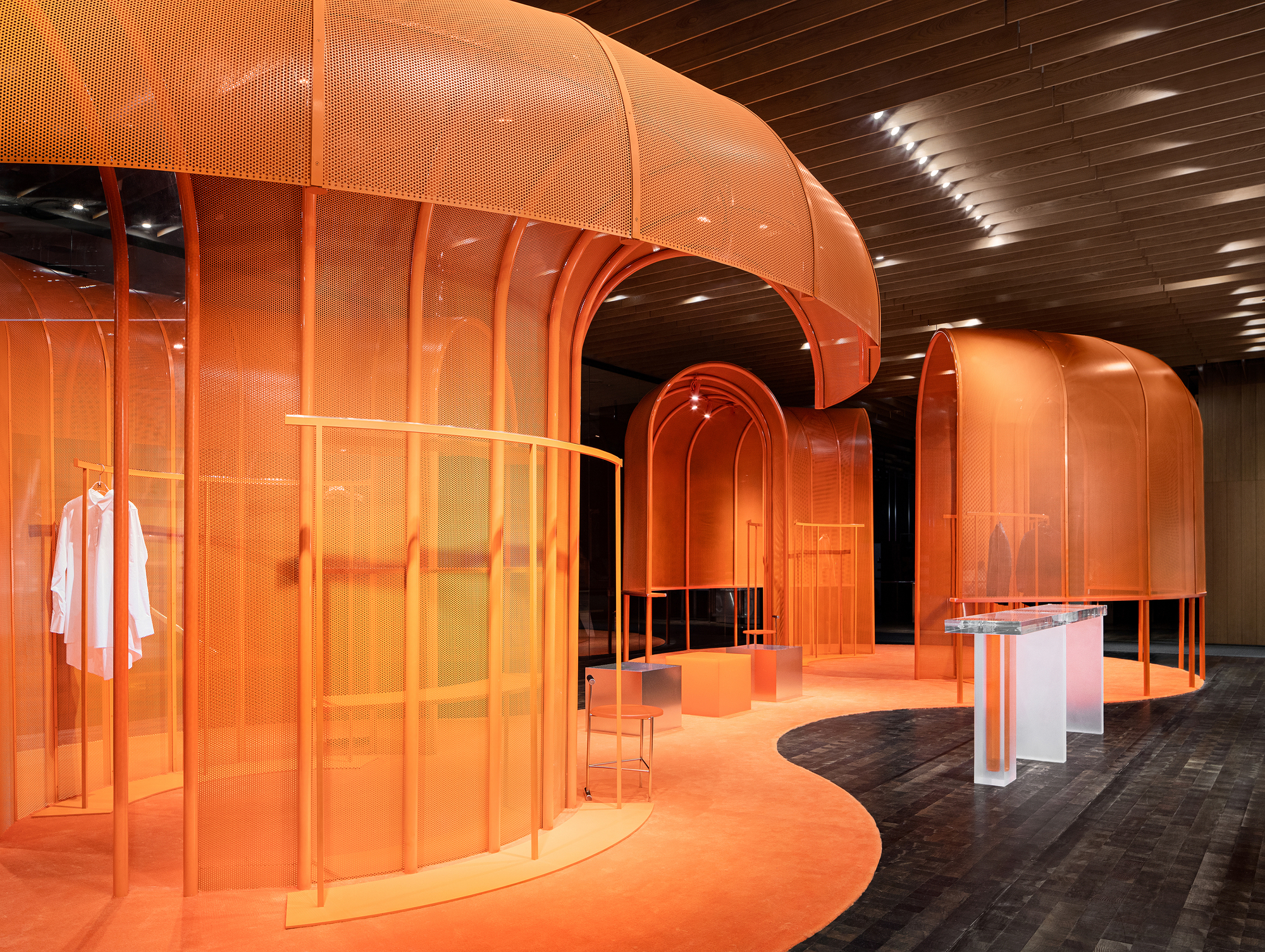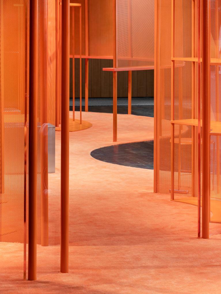 In un arancione acceso, tonalità scelta per il calore che trasmette e perché solitamente associata alla creatività, tali strutture metalliche perforate si ergono come sculture o membrane architettoniche avvolgenti su pedane curvilinee poste su pavimenti in legno scuro.