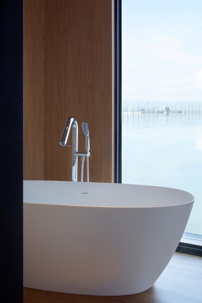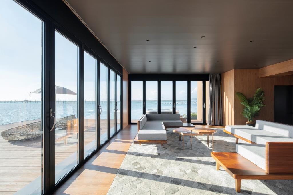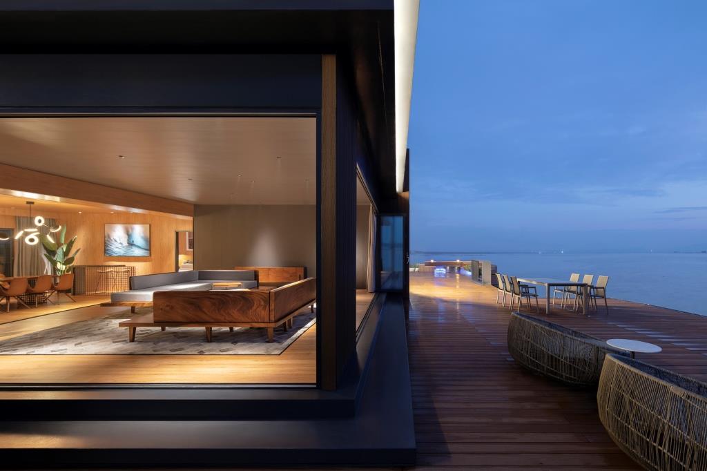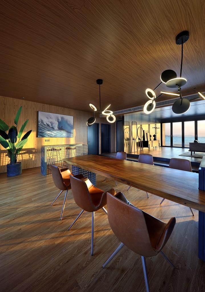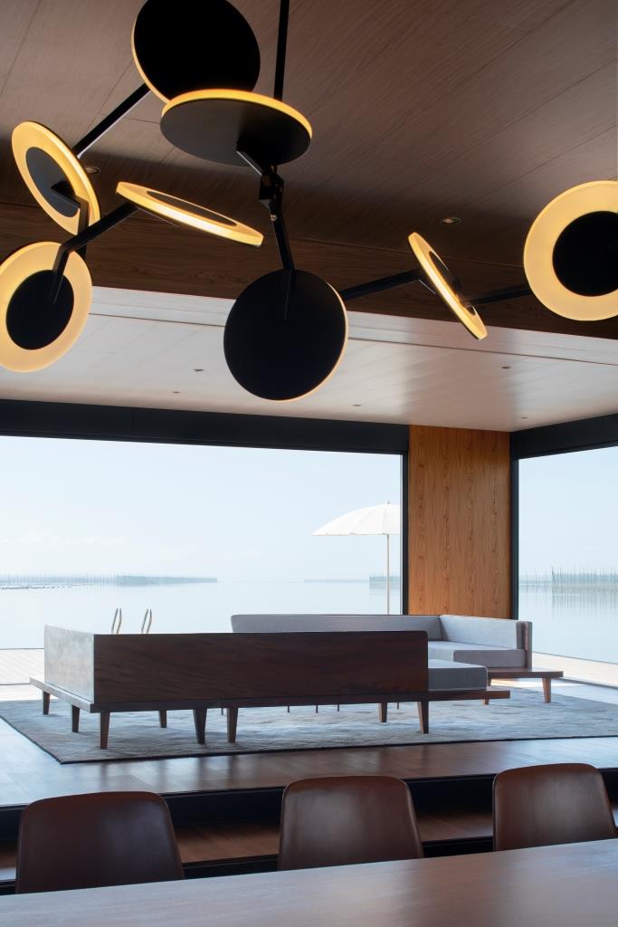 Da queste valutazioni di natura tecnica è scaturita una rigorosa scelta dei materiali, che ha a sua volta influenzato le forme e l’articolazione degli spazi. La copertura, ad esempio, adotta materiali decorativi a prova di corrosione comunemente utilizzati nei terminal aeroportuali e negli yacht, i pavimenti del deck esterno, caratterizzati da una texture che richiama il legno massello, sono ecologici e resistenti alle intemperie, mentre l’alimentazione elettrica è assicurata da cablaggi che scorrono lungo il fondale marino.