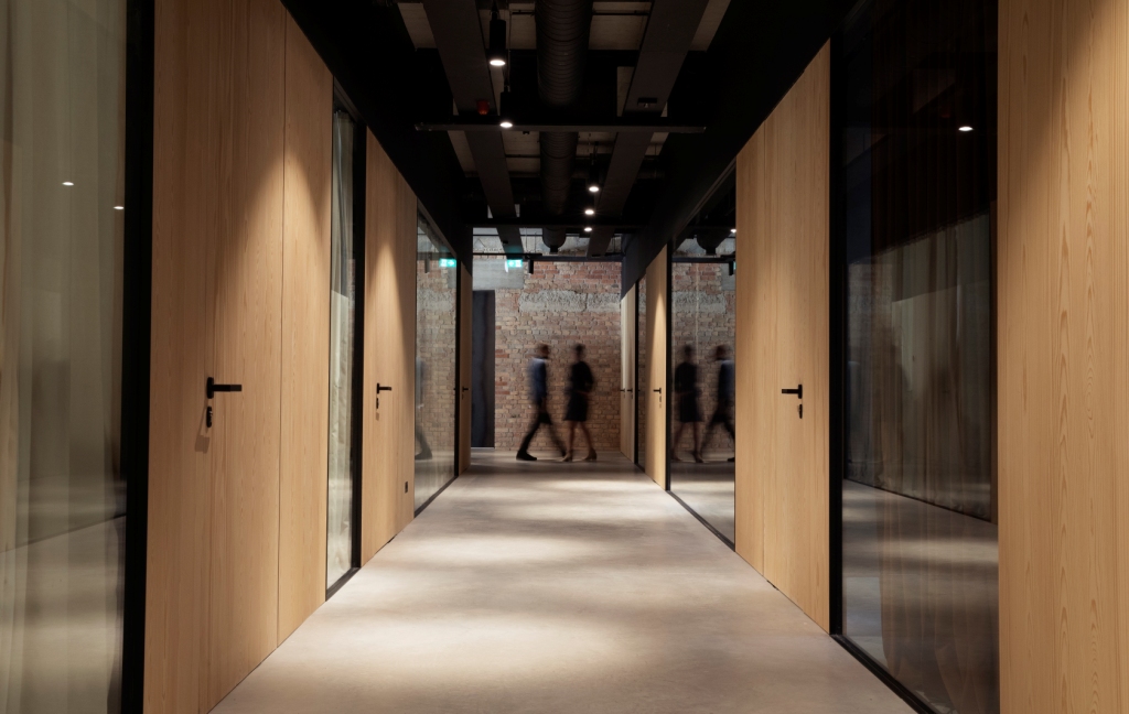 Dato il buono stato di conservazione della struttura gli interventi di riqualificazione sono stati ridotti al minimo, privilegiando l’utilizzo di materiali – mattoni a vista, intonaco grezzo, pavimenti in cemento – coerenti con quelli originali. Legno di quercia per i pavimenti, abete rosso per le pareti e acciaio grezzo per rivestimenti e finiture connotano invece le aree di nuova realizzazione, creando un mood caldo e accogliente di ispirazione contemporanea.
