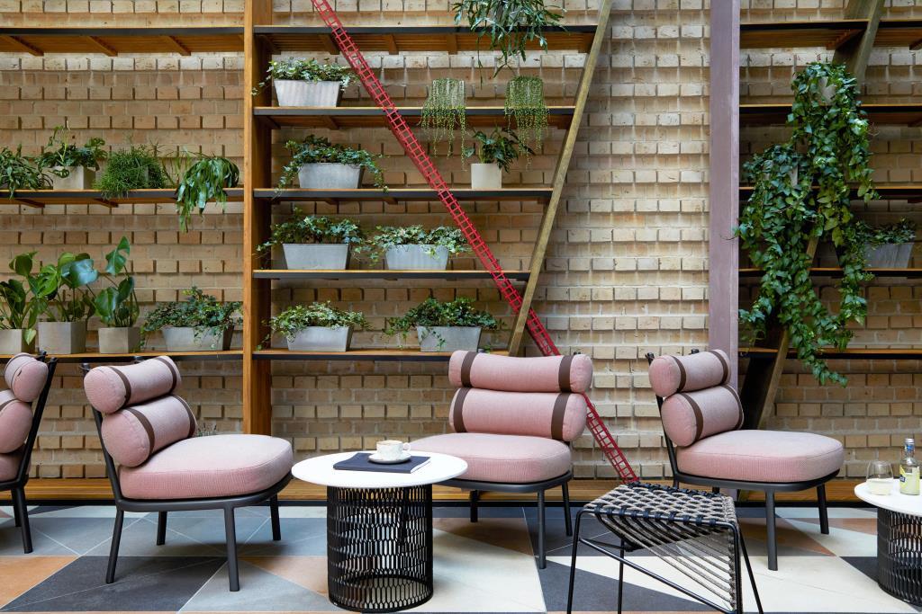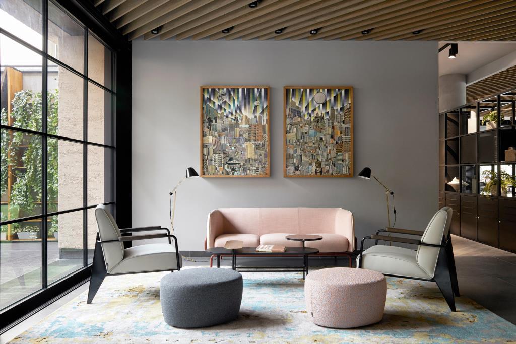 Completa il tutto una raffinata selezione di mobili di produttori europei quali il danese Carl Hansen & Søn, l’italiano Moroso, lo svedese Fogia e lo spagnolo Kettal, mentre nelle camere spiccano i tappeti annodati a mano di Golran 1898 e l’illuminazione di &Tradition, marchio scandinavo attento alla sostenibilità. Vetrate a tutta parete, scaffalature leggere e giochi di geometrie fanno il resto, assieme a una palette di colori morbidamente pop punteggiata di rosa polverosi e verdi-azzurri.