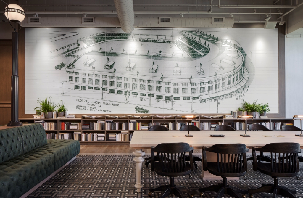 L’ampia hall con l’area bar, posta al secondo piano, ha tutto l’appeal di un elegante club sportivo di inizio Novecento, costellata degli elementi tipici del DNA di Chicago: alle pareti sono riprodotti i disegni originali dell’architetto Taylor Davis per Wrigley Field, gli studi di dettaglio dell’arena, ma anche foto sue e della sua famiglia in bianco e nero, insieme a scatti, sempre datati, della città.