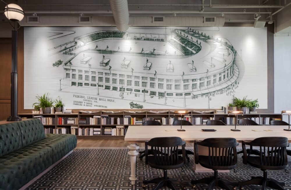 L’ampia hall con l’area bar, posta al secondo piano, ha tutto l’appeal di un elegante club sportivo di inizio Novecento, costellata degli elementi tipici del DNA di Chicago: alle pareti sono riprodotti i disegni originali dell’architetto Taylor Davis per Wrigley Field, gli studi di dettaglio dell’arena, ma anche foto sue e della sua famiglia in bianco e nero, insieme a scatti, sempre datati, della città.